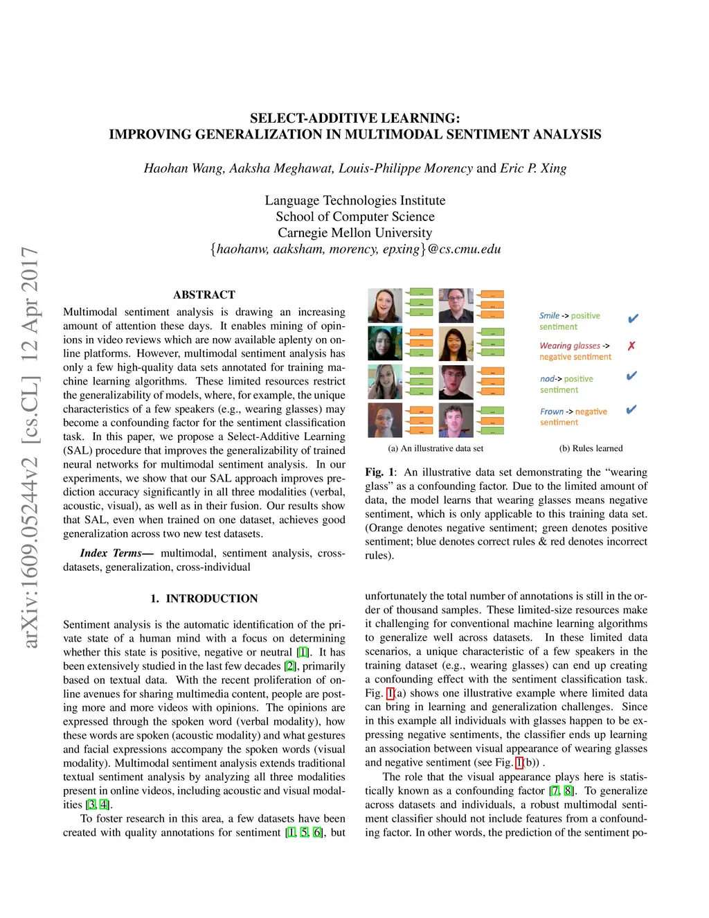 Multimodal sentiment analysis is drawing an increasing amount of attention these days. It enables mining of opinions in video reviews which are now available aplenty on online platforms. However, multimodal sentiment analysis has only a few high-quality data sets annotated for training machine learning algorithms. These limited resources restrict the generalizability of models, where, for example, the unique characteristics of a few speakers (e.g., wearing glasses) may become a confounding factor for the sentiment classification task. In this paper, we propose a Select-Additive Learning (SAL) procedure that improves the generalizability of trained neural networks for multimodal sentiment analysis. In our experiments, we show that our SAL approach improves prediction accuracy significantly in all three modalities (verbal, acoustic, visual), as well as in their fusion. Our results show that SAL, even when trained on one dataset, achieves good generalization across two new test datasets.