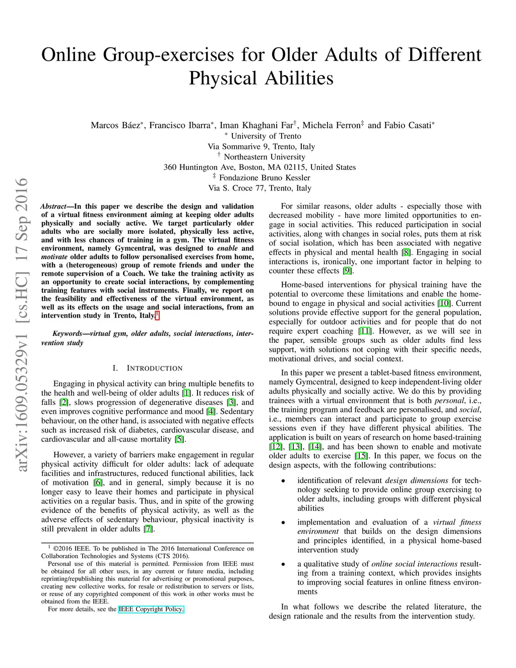 In this paper we describe the design and validation of a virtual fitness environment aiming at keeping older adults physically and socially active. We target particularly older adults who are socially more isolated, physically less active, and with less chances of training in a gym. The virtual fitness environment, namely Gymcentral, was designed to enable and motivate older adults to follow personalised exercises from home, with a (heterogeneous) group of remote friends and under the remote supervision of a Coach. We take the training activity as an opportunity to create social interactions, by complementing training features with social instruments. Finally, we report on the feasibility and effectiveness of the virtual environment, as well as its effects on the usage and social interactions, from an intervention study in Trento, Italy