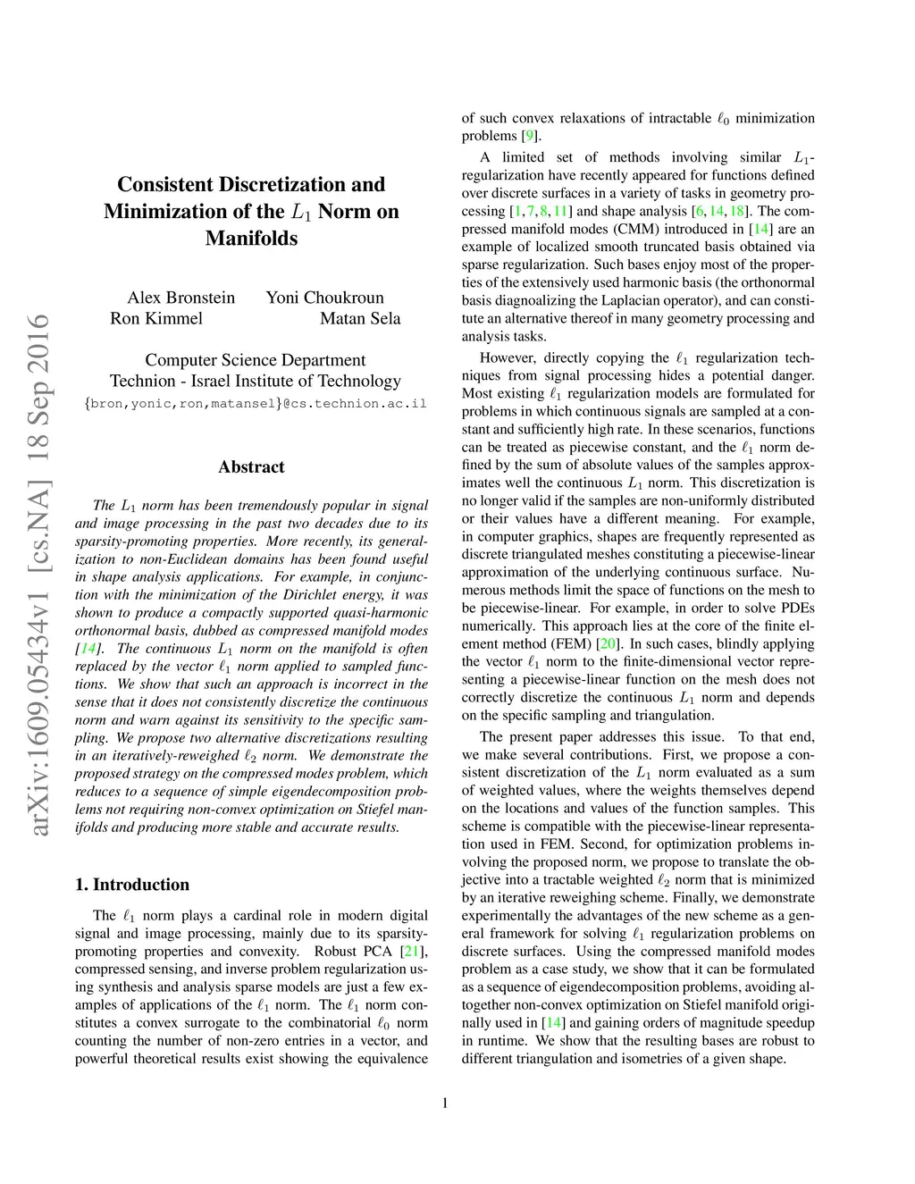 The L1 norm has been tremendously popular in signal and image processing in the past two decades due to its sparsity-promoting properties. More recently, its generalization to non-Euclidean domains has been found useful in shape analysis applications. For example, in conjunction with the minimization of the Dirichlet energy, it was shown to produce a compactly supported quasi-harmonic orthonormal basis, dubbed as compressed manifold modes. The continuous L1 norm on the manifold is often replaced by the vector l1 norm applied to sampled functions. We show that such an approach is incorrect in the sense that it does not consistently discretize the continuous norm and warn against its sensitivity to the specific sampling. We propose two alternative discretizations resulting in an iteratively-reweighed l2 norm. We demonstrate the proposed strategy on the compressed modes problem, which reduces to a sequence of simple eigendecomposition problems not requiring non-convex optimization on Stiefel manifolds and producing more stable and accurate results.