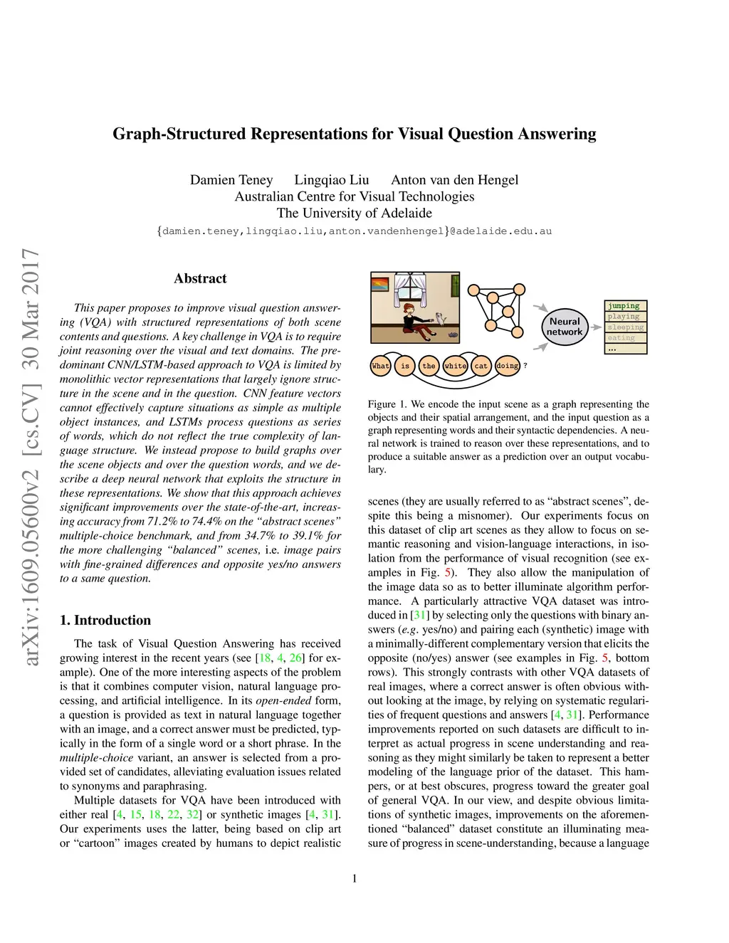 This paper proposes to improve visual question answering (VQA) with structured representations of both scene contents and questions. A key challenge in VQA is to require joint reasoning over the visual and text domains. The predominant CNN/LSTM-based approach to VQA is limited by monolithic vector representations that largely ignore structure in the scene and in the form of the question. CNN feature vectors cannot effectively capture situations as simple as multiple object instances, and LSTMs process questions as series of words, which does not reflect the true complexity of language structure. We instead propose to build graphs over the scene objects and over the question words, and we describe a deep neural network that exploits the structure in these representations. This shows significant benefit over the sequential processing of LSTMs. The overall efficacy of our approach is demonstrated by significant improvements over the state-of-the-art, from 71.2% to 74.4% in accuracy on the "abstract scenes" multiple-choice benchmark, and from 34.7% to 39.1% in accuracy over pairs of "balanced" scenes, i.e. images with fine-grained differences and opposite yes/no answers to a same question.