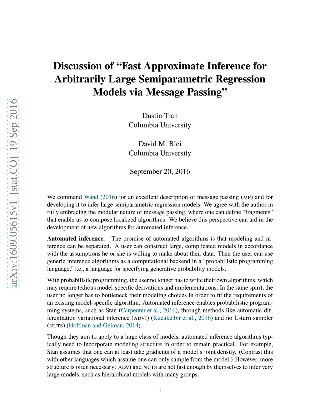 Discussion paper on "Fast Approximate Inference for Arbitrarily Large Semiparametric Regression Models via Message Passing" by Wand [arXiv:1602.07412].