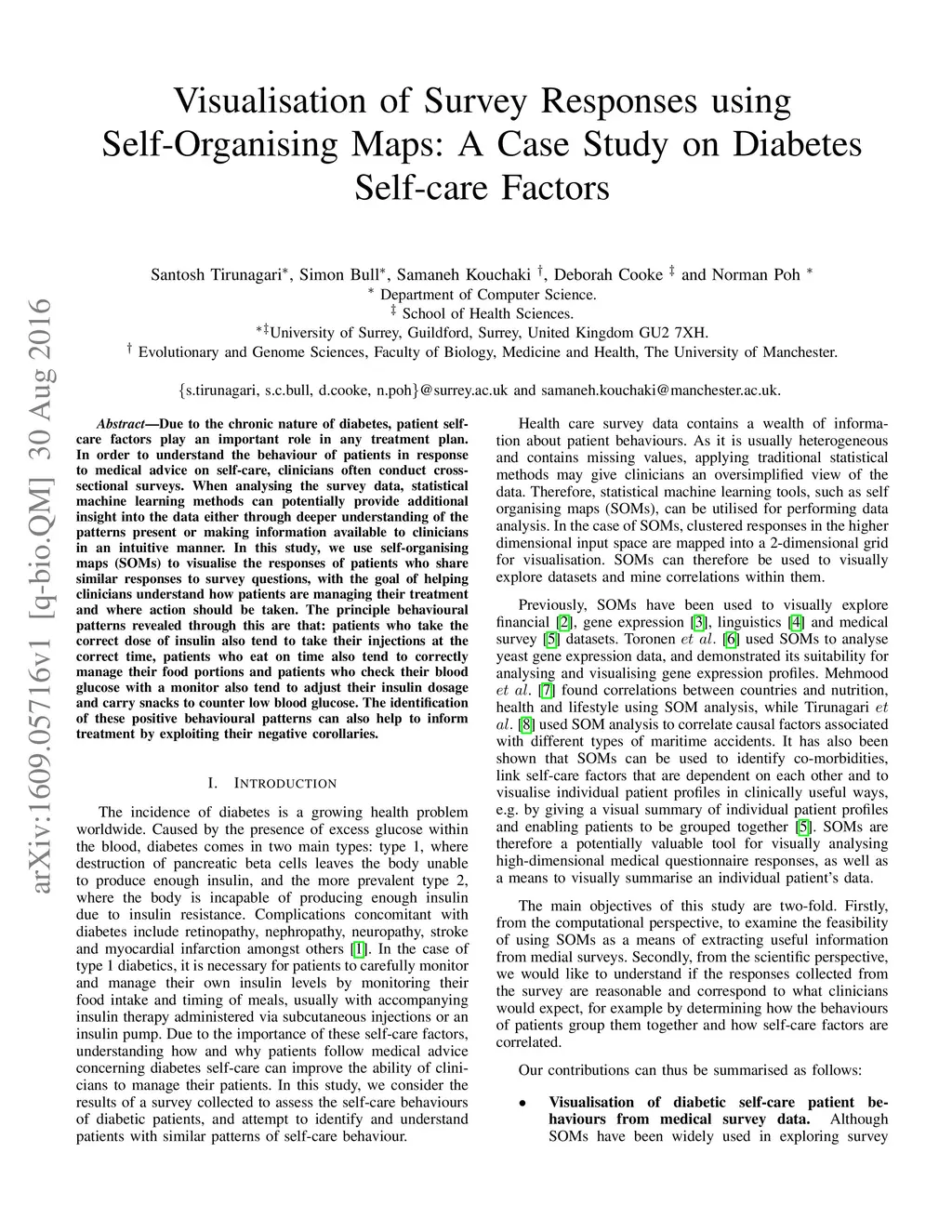 Due to the chronic nature of diabetes, patient self-care factors play an important role in any treatment plan. In order to understand the behaviour of patients in response to medical advice on self-care, clinicians often conduct cross-sectional surveys. When analysing the survey data, statistical machine learning methods can potentially provide additional insight into the data either through deeper understanding of the patterns present or making information available to clinicians in an intuitive manner. In this study, we use self-organising maps (SOMs) to visualise the responses of patients who share similar responses to survey questions, with the goal of helping clinicians understand how patients are managing their treatment and where action should be taken. The principle behavioural patterns revealed through this are that: patients who take the correct dose of insulin also tend to take their injections at the correct time, patients who eat on time also tend to correctly manage their food portions and patients who check their blood glucose with a monitor also tend to adjust their insulin dosage and carry snacks to counter low blood glucose. The identification of these positive behavioural patterns can also help to inform treatment by exploiting their negative corollaries.