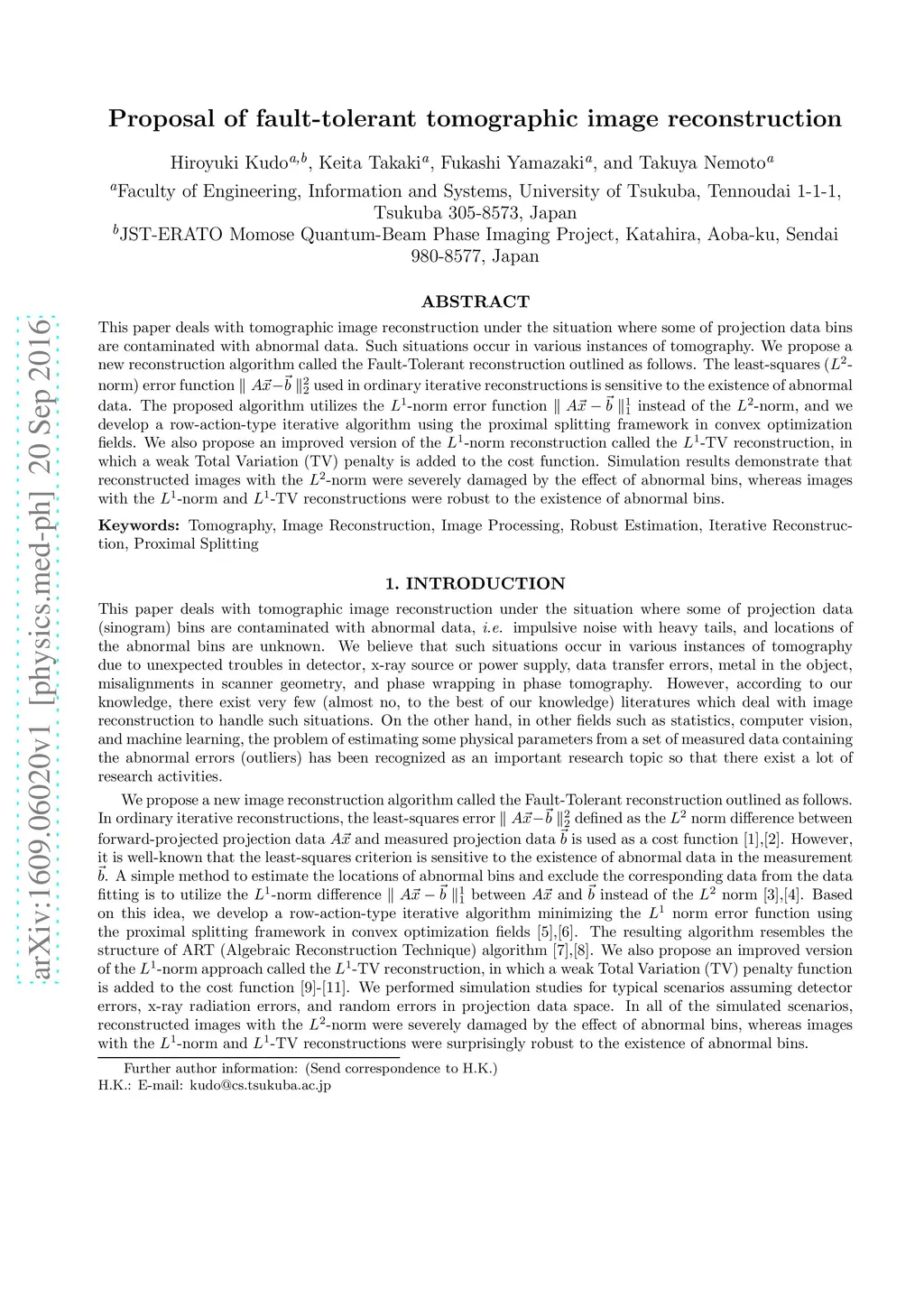 This paper deals with tomographic image reconstruction under the situation where some of projection data bins are contaminated with abnormal data. Such situations occur in various instances of tomography. We propose a new reconstruction algorithm called the Fault-Tolerant reconstruction outlined as follows. The least-squares (L2-norm) error function ||Ax-b||_2^2 used in ordinary iterative reconstructions is sensitive to the existence of abnormal data. The proposed algorithm utilizes the L1-norm error function ||Ax-b||_1^1 instead of the L2-norm, and we develop a row-action-type iterative algorithm using the proximal splitting framework in convex optimization fields. We also propose an improved version of the L1-norm reconstruction called the L1-TV reconstruction, in which a weak Total Variation (TV) penalty is added to the cost function. Simulation results demonstrate that reconstructed images with the L2-norm were severely damaged by the effect of abnormal bins, whereas images with the L1-norm and L1-TV reconstructions were robust to the existence of abnormal bins.