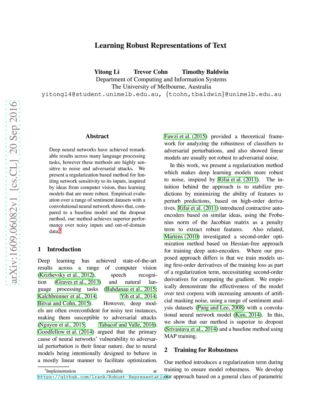 Deep neural networks have achieved remarkable results across many language processing tasks, however these methods are highly sensitive to noise and adversarial attacks. We present a regularization based method for limiting network sensitivity to its inputs, inspired by ideas from computer vision, thus learning models that are more robust. Empirical evaluation over a range of sentiment datasets with a convolutional neural network shows that, compared to a baseline model and the dropout method, our method achieves superior performance over noisy inputs and out-of-domain data.