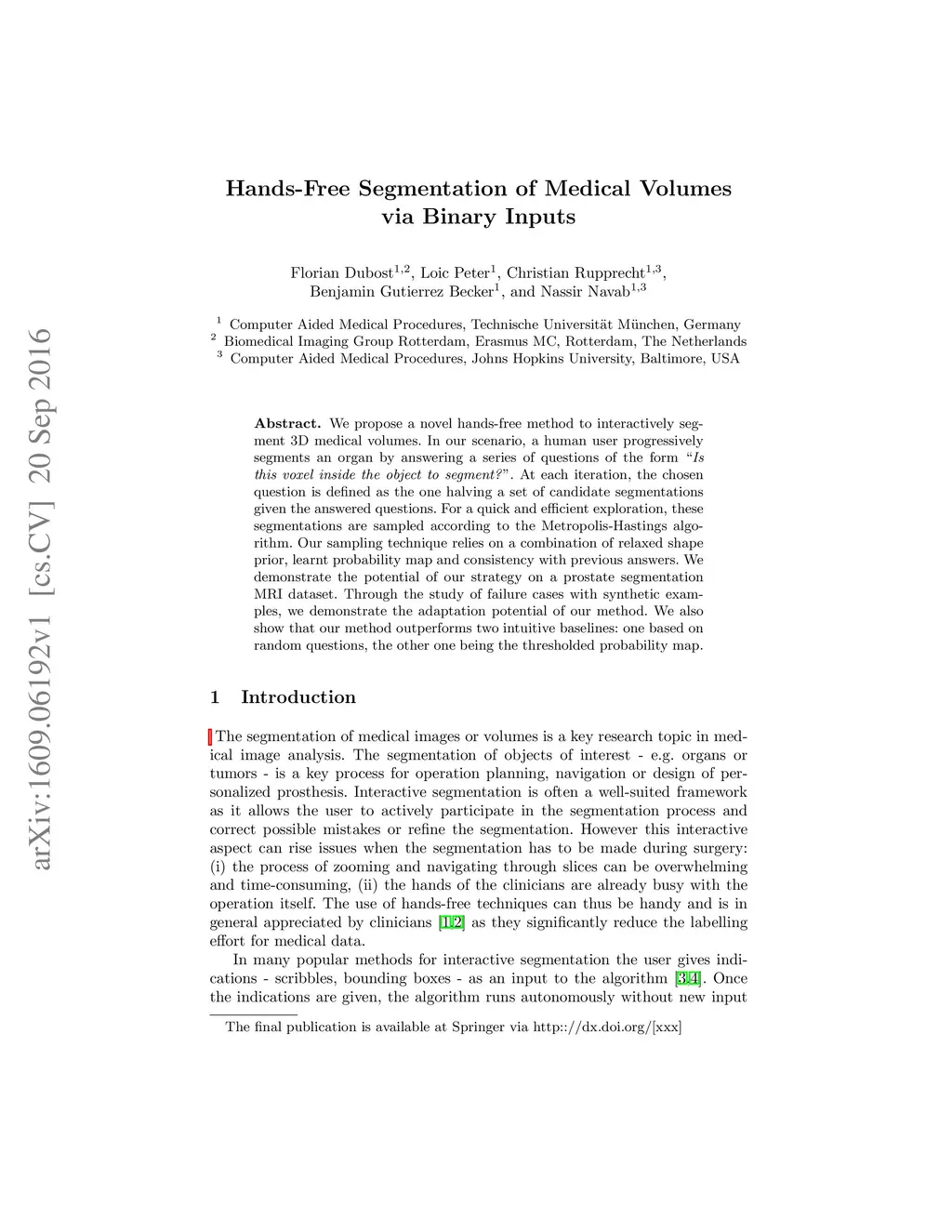We propose a novel hands-free method to interactively segment 3D medical volumes. In our scenario, a human user progressively segments an organ by answering a series of questions of the form "Is this voxel inside the object to segment?". At each iteration, the chosen question is defined as the one halving a set of candidate segmentations given the answered questions. For a quick and efficient exploration, these segmentations are sampled according to the Metropolis-Hastings algorithm. Our sampling technique relies on a combination of relaxed shape prior, learnt probability map and consistency with previous answers. We demonstrate the potential of our strategy on a prostate segmentation MRI dataset. Through the study of failure cases with synthetic examples, we demonstrate the adaptation potential of our method. We also show that our method outperforms two intuitive baselines: one based on random questions, the other one being the thresholded probability map.