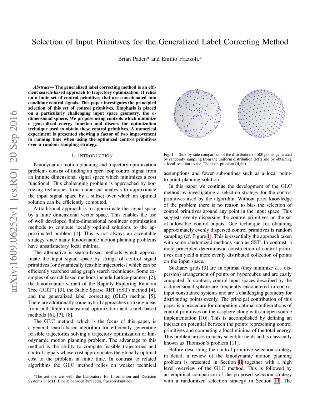 The generalized label correcting method is an efficient search-based approach to trajectory optimization. It relies on a finite set of control primitives that are concatenated into candidate control signals. This paper investigates the principled selection of this set of control primitives. Emphasis is placed on a particularly challenging input space geometry, the -dimensional sphere. We propose using controls which minimize a generalized energy function and discuss the optimization technique used to obtain these control primitives. A numerical experiment is presented showing a factor of two improvement in running time when using the optimized control primitives over a random sampling strategy.