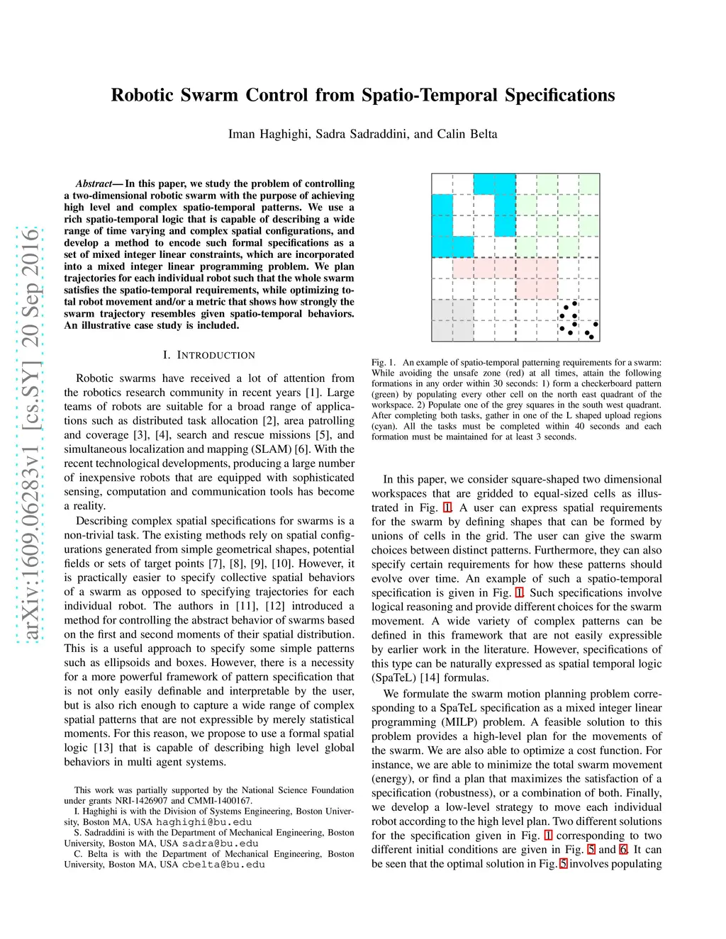 In this paper, we study the problem of controlling a two-dimensional robotic swarm with the purpose of achieving high level and complex spatio-temporal patterns. We use a rich spatio-temporal logic that is capable of describing a wide range of time varying and complex spatial configurations, and develop a method to encode such formal specifications as a set of mixed integer linear constraints, which are incorporated into a mixed integer linear programming problem. We plan trajectories for each individual robot such that the whole swarm satisfies the spatio-temporal requirements, while optimizing total robot movement and/or a metric that shows how strongly the swarm trajectory resembles given spatio-temporal behaviors. An illustrative case study is included.