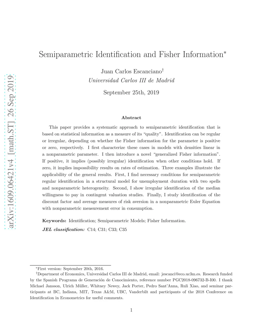 This paper provides a systematic approach to semiparametric identification that is based on statistical information. Identification can be regular or irregular, depending on whether the Fisher information for the parameter is positive or singular, respectively. I first characterize these two cases in models with densities linear in a nonparametric parameter. This analysis leads to simple-to-check necessary conditions for regular identification in many linear and nonlinear models. I then introduce a novel "generalized Fisher information". If positive, it implies (possibly irregular) identification when other conditions hold. If zero, it implies impossibility results on rates of estimation. The usefulness of the theory is illustrated by showing that distributions and quantiles of unobserved heterogeneity are not regularly identified in many economic models of interest. Similarly, I show that average marginal effects (AME) and the proportion of individuals with positive AME cannot be regularly identified in a correlated random effects model. I also obtain primitive conditions for regular identification of the discount factor and average measures of risk aversion in a nonparametric Euler Equation with nonparametric measurement error in consumption.