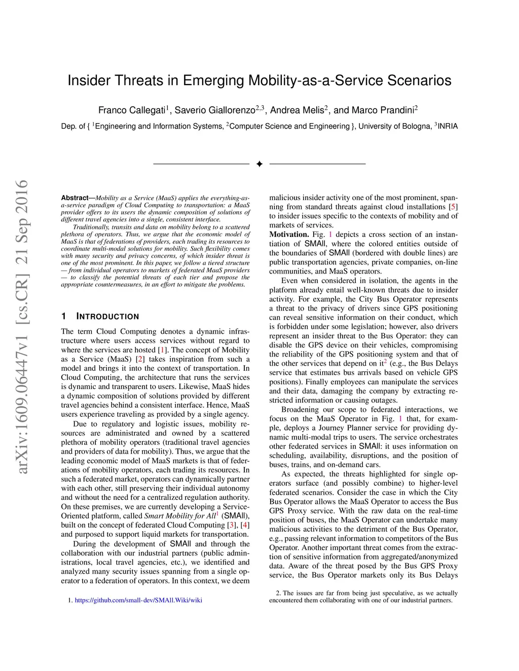Mobility as a Service (MaaS) applies the everything-as-a-service paradigm of Cloud Computing to transportation: a MaaS provider offers to its users the dynamic composition of solutions of different travel agencies into a single, consistent interface. Traditionally, transits and data on mobility belong to a scattered plethora of operators. Thus, we argue that the economic model of MaaS is that of federations of providers, each trading its resources to coordinate multi-modal solutions for mobility. Such flexibility comes with many security and privacy concerns, of which insider threat is one of the most prominent. In this paper, we follow a tiered structure --- from individual operators to markets of federated MaaS providers --- to classify the potential threats of each tier and propose the appropriate countermeasures, in an effort to mitigate the problems.