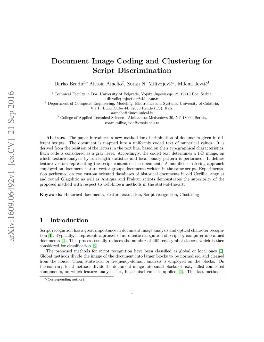 The paper introduces a new method for discrimination of documents given in different scripts. The document is mapped into a uniformly coded text of numerical values. It is derived from the position of the letters in the text line, based on their typographical characteristics. Each code is considered as a gray level. Accordingly, the coded text determines a 1-D image, on which texture analysis by run-length statistics and local binary pattern is performed. It defines feature vectors representing the script content of the document. A modified clustering approach employed on document feature vector groups documents written in the same script. Experimentation performed on two custom oriented databases of historical documents in old Cyrillic, angular and round Glagolitic as well as Antiqua and Fraktur scripts demonstrates the superiority of the proposed method with respect to well-known methods in the state-of-the-art.