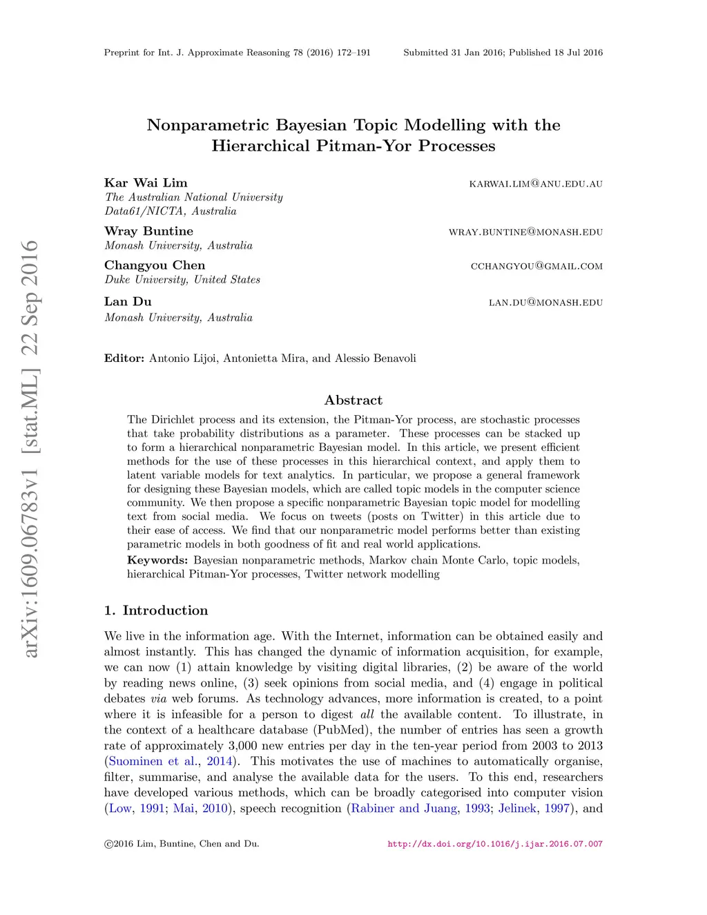 The Dirichlet process and its extension, the Pitman-Yor process, are stochastic processes that take probability distributions as a parameter. These processes can be stacked up to form a hierarchical nonparametric Bayesian model. In this article, we present efficient methods for the use of these processes in this hierarchical context, and apply them to latent variable models for text analytics. In particular, we propose a general framework for designing these Bayesian models, which are called topic models in the computer science community. We then propose a specific nonparametric Bayesian topic model for modelling text from social media. We focus on tweets (posts on Twitter) in this article due to their ease of access. We find that our nonparametric model performs better than existing parametric models in both goodness of fit and real world applications.