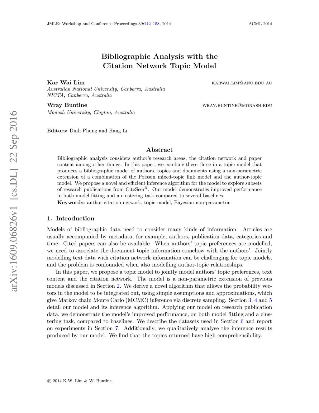 Bibliographic analysis considers author's research areas, the citation network and paper content among other things. In this paper, we combine these three in a topic model that produces a bibliographic model of authors, topics and documents using a non-parametric extension of a combination of the Poisson mixed-topic link model and the author-topic model. We propose a novel and efficient inference algorithm for the model to explore subsets of research publications from CiteSeerX. Our model demonstrates improved performance in both model fitting and a clustering task compared to several baselines.