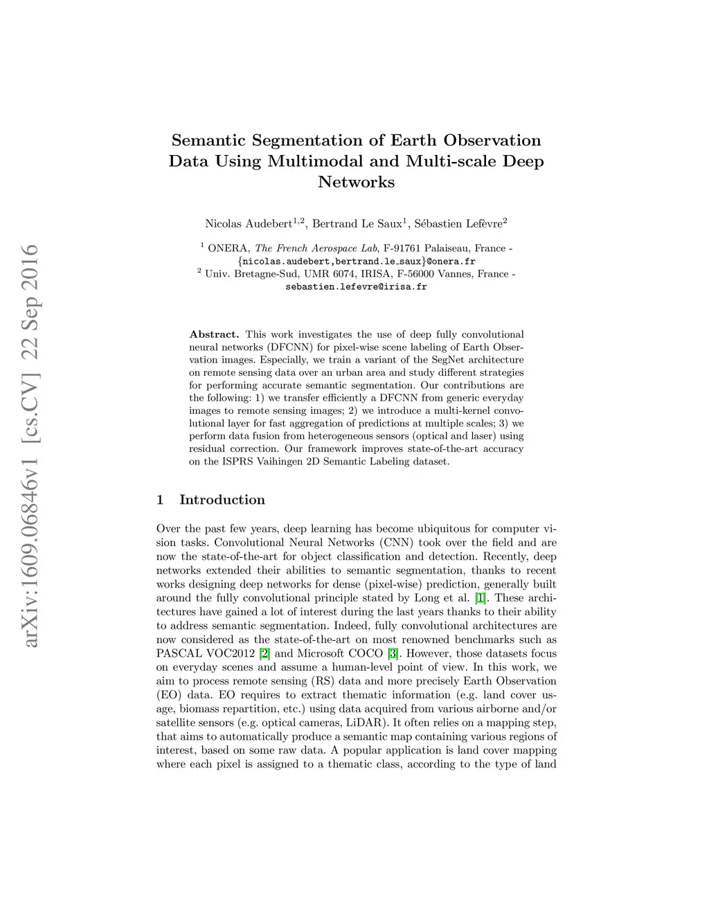 This work investigates the use of deep fully convolutional neural networks (DFCNN) for pixel-wise scene labeling of Earth Observation images. Especially, we train a variant of the SegNet architecture on remote sensing data over an urban area and study different strategies for performing accurate semantic segmentation. Our contributions are the following: 1) we transfer efficiently a DFCNN from generic everyday images to remote sensing images; 2) we introduce a multi-kernel convolutional layer for fast aggregation of predictions at multiple scales; 3) we perform data fusion from heterogeneous sensors (optical and laser) using residual correction. Our framework improves state-of-the-art accuracy on the ISPRS Vaihingen 2D Semantic Labeling dataset.