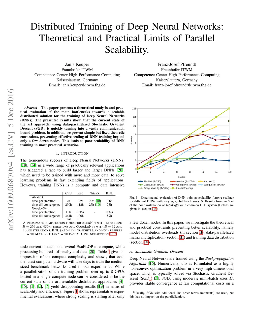 This paper presents a theoretical analysis and practical evaluation of the main bottlenecks towards a scalable distributed solution for the training of Deep Neuronal Networks (DNNs). The presented results show, that the current state of the art approach, using data-parallelized Stochastic Gradient Descent (SGD), is quickly turning into a vastly communication bound problem. In addition, we present simple but fixed theoretic constraints, preventing effective scaling of DNN training beyond only a few dozen nodes. This leads to poor scalability of DNN training in most practical scenarios.