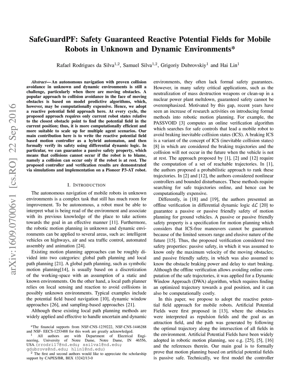 An autonomous navigation with proven collision avoidance in unknown and dynamic environments is still a challenge, particularly when there are moving obstacles. A popular approach to collision avoidance in the face of moving obstacles is based on model predictive algorithms, which, however, may be computationally expensive. Hence, we adopt a reactive potential field approach here. At every cycle, the proposed approach requires only current robot states relative to the closest obstacle point to find the potential field in the current position; thus, it is more computationally efficient and more suitable to scale up for multiple agent scenarios. Our main contribution here is to write the reactive potential field based motion controller as a hybrid automaton, and then formally verify its safety using differential dynamic logic. In particular, we can guarantee a passive safety property, which means that collisions cannot occur if the robot is to blame, namely a collision can occur only if the robot is at rest. The proposed controller and verification results are demonstrated via simulations and implementation on a Pioneer P3-AT robot.