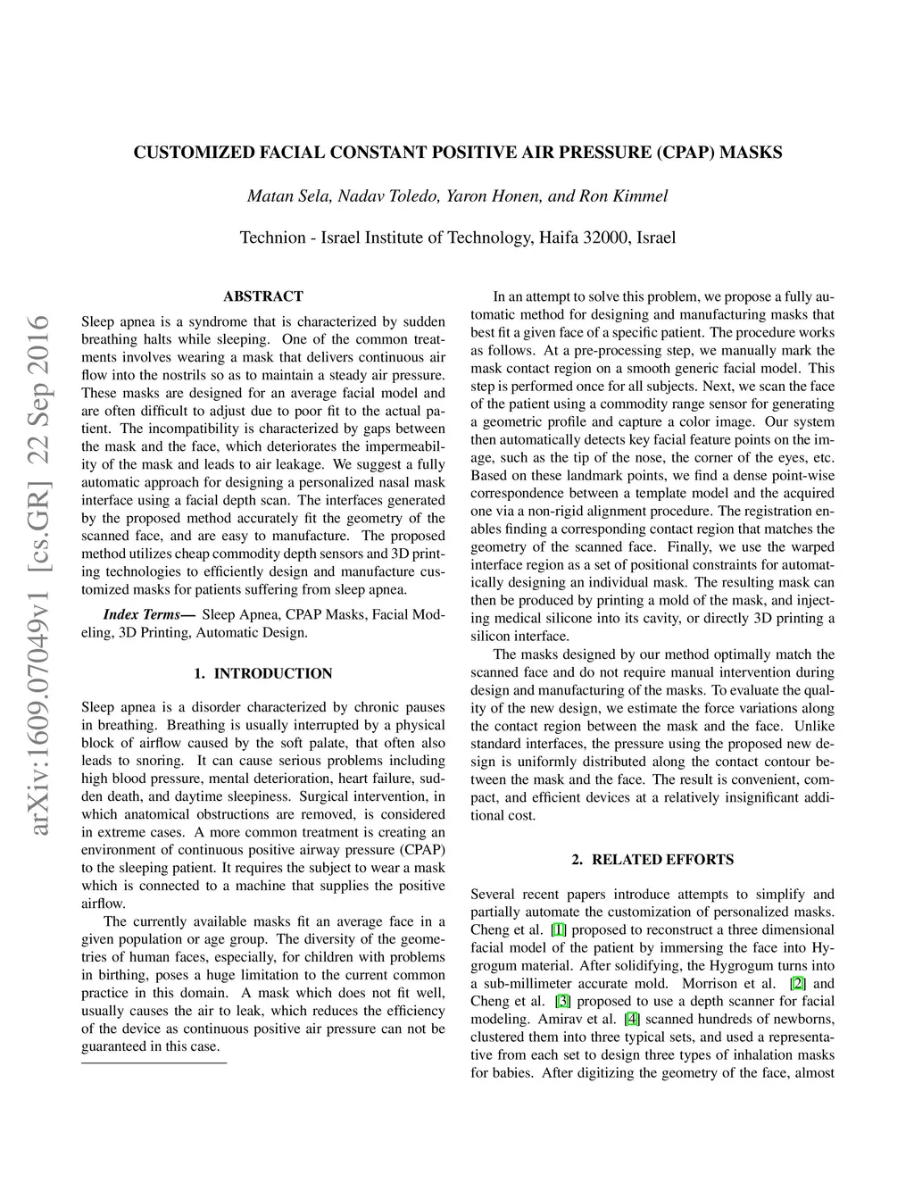 Sleep apnea is a syndrome that is characterized by sudden breathing halts while sleeping. One of the common treatments involves wearing a mask that delivers continuous air flow into the nostrils so as to maintain a steady air pressure. These masks are designed for an average facial model and are often difficult to adjust due to poor fit to the actual patient. The incompatibility is characterized by gaps between the mask and the face, which deteriorates the impermeability of the mask and leads to air leakage. We suggest a fully automatic approach for designing a personalized nasal mask interface using a facial depth scan. The interfaces generated by the proposed method accurately fit the geometry of the scanned face, and are easy to manufacture. The proposed method utilizes cheap commodity depth sensors and 3D printing technologies to efficiently design and manufacture customized masks for patients suffering from sleep apnea.
