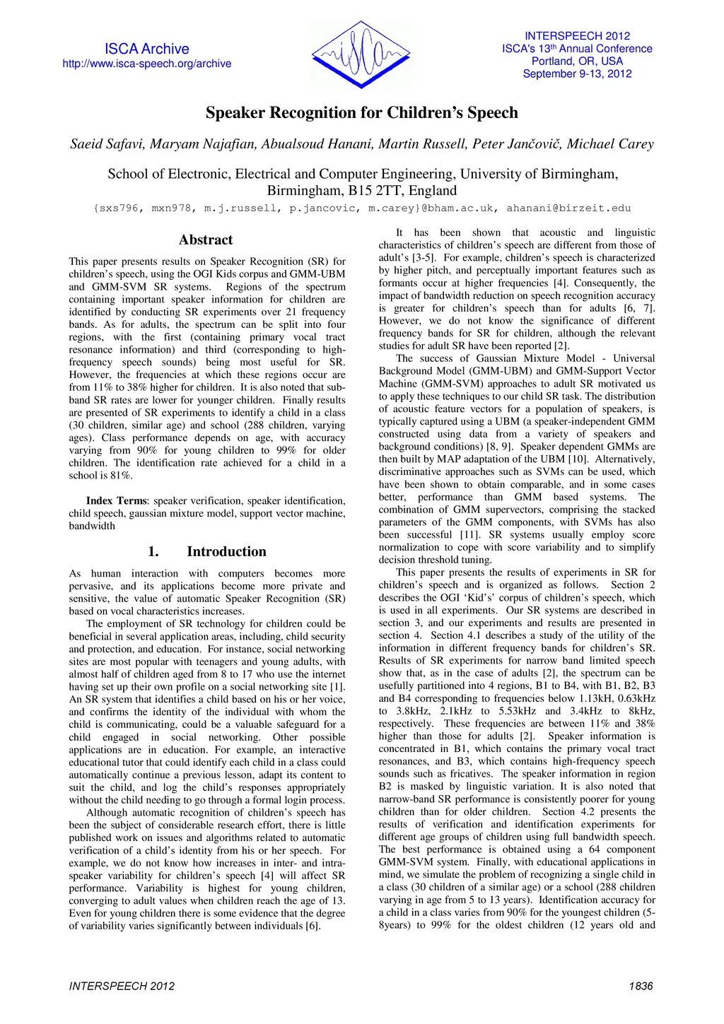 This paper presents results on Speaker Recognition (SR) for children's speech, using the OGI Kids corpus and GMM-UBM and GMM-SVM SR systems. Regions of the spectrum containing important speaker information for children are identified by conducting SR experiments over 21 frequency bands. As for adults, the spectrum can be split into four regions, with the first (containing primary vocal tract resonance information) and third (corresponding to high frequency speech sounds) being most useful for SR. However, the frequencies at which these regions occur are from 11% to 38% higher for children. It is also noted that subband SR rates are lower for younger children. Finally results are presented of SR experiments to identify a child in a class (30 children, similar age) and school (288 children, varying ages). Class performance depends on age, with accuracy varying from 90% for young children to 99% for older children. The identification rate achieved for a child in a school is 81%.