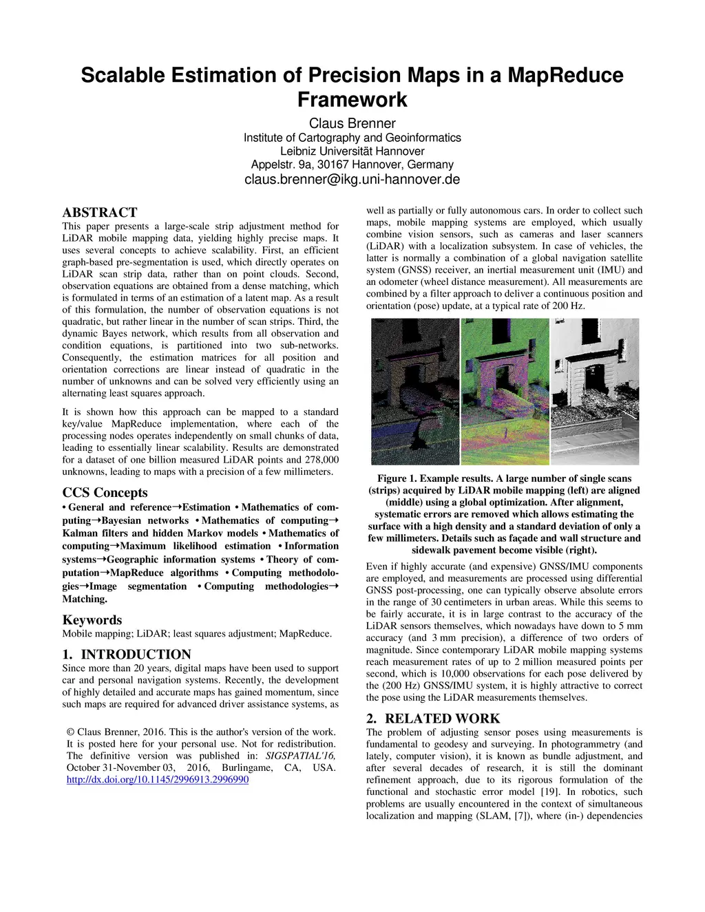 This paper presents a large-scale strip adjustment method for LiDAR mobile mapping data, yielding highly precise maps. It uses several concepts to achieve scalability. First, an efficient graph-based pre-segmentation is used, which directly operates on LiDAR scan strip data, rather than on point clouds. Second, observation equations are obtained from a dense matching, which is formulated in terms of an estimation of a latent map. As a result of this formulation, the number of observation equations is not quadratic, but rather linear in the number of scan strips. Third, the dynamic Bayes network, which results from all observation and condition equations, is partitioned into two sub-networks. Consequently, the estimation matrices for all position and orientation corrections are linear instead of quadratic in the number of unknowns and can be solved very efficiently using an alternating least squares approach. It is shown how this approach can be mapped to a standard key/value MapReduce implementation, where each of the processing nodes operates independently on small chunks of data, leading to essentially linear scalability. Results are demonstrated for a dataset of one billion measured LiDAR points and 278,000 unknowns, leading to maps with a precision of a few millimeters.