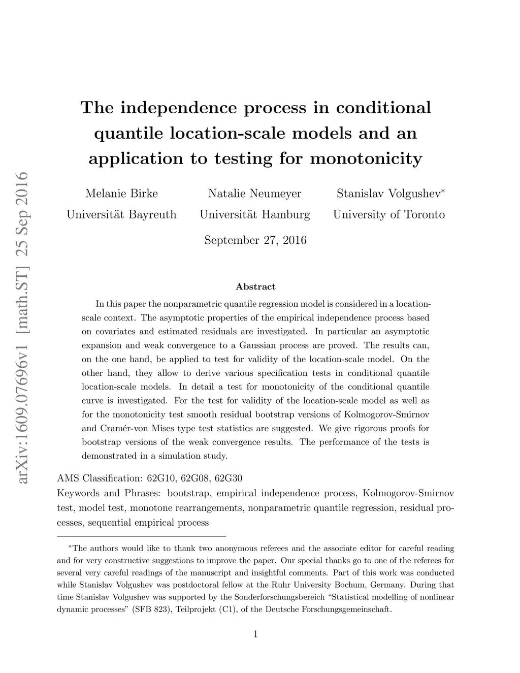 The independence process in conditional quantile location-scale models
