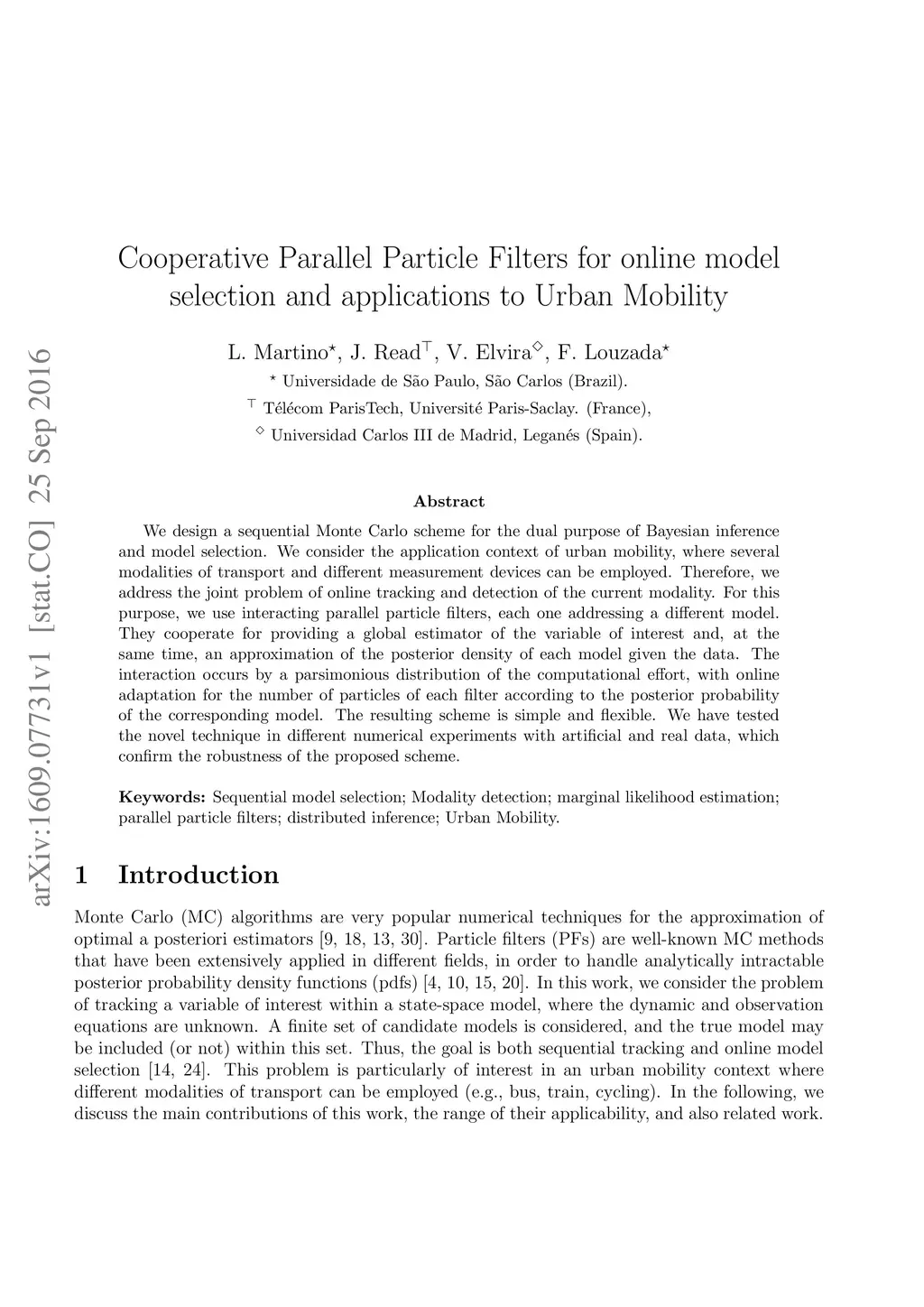 We design a sequential Monte Carlo scheme for the dual purpose of Bayesian inference and model selection. We consider the application context of urban mobility, where several modalities of transport and different measurement devices can be employed. Therefore, we address the joint problem of online tracking and detection of the current modality. For this purpose, we use interacting parallel particle filters, each one addressing a different model. They cooperate for providing a global estimator of the variable of interest and, at the same time, an approximation of the posterior density of each model given the data. The interaction occurs by a parsimonious distribution of the computational effort, with online adaptation for the number of particles of each filter according to the posterior probability of the corresponding model. The resulting scheme is simple and flexible. We have tested the novel technique in different numerical experiments with artificial and real data, which confirm the robustness of the proposed scheme.