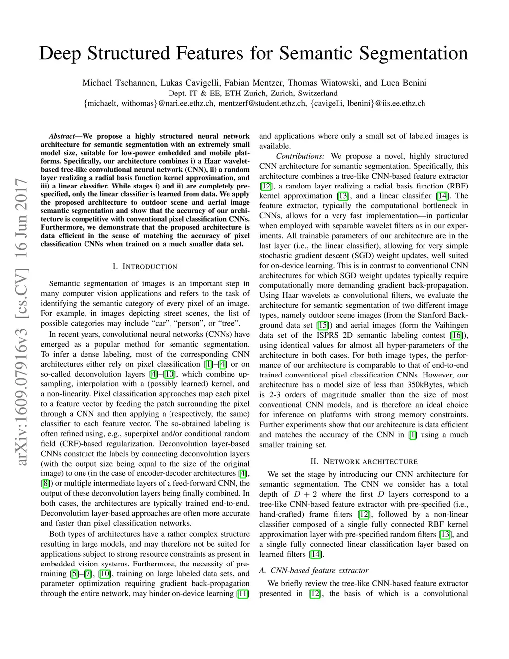 We propose a highly structured neural network architecture for semantic segmentation with an extremely small model size, suitable for low-power embedded and mobile platforms. Specifically, our architecture combines i) a Haar wavelet-based tree-like convolutional neural network (CNN), ii) a random layer realizing a radial basis function kernel approximation, and iii) a linear classifier. While stages i) and ii) are completely pre-specified, only the linear classifier is learned from data. We apply the proposed architecture to outdoor scene and aerial image semantic segmentation and show that the accuracy of our architecture is competitive with conventional pixel classification CNNs. Furthermore, we demonstrate that the proposed architecture is data efficient in the sense of matching the accuracy of pixel classification CNNs when trained on a much smaller data set.