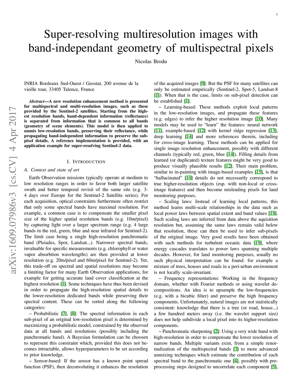 Super-resolving multiresolution images with band-independant geometry of multispectral pixels