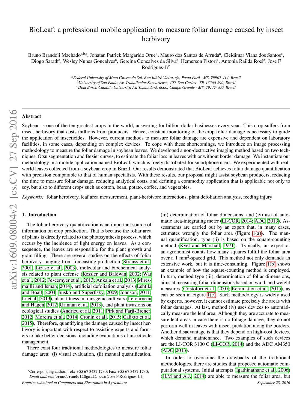 Soybean is one of the ten greatest crops in the world, answering for billion-dollar businesses every year. This crop suffers from insect herbivory that costs millions from producers. Hence, constant monitoring of the crop foliar damage is necessary to guide the application of insecticides. However, current methods to measure foliar damage are expensive and dependent on laboratory facilities, in some cases, depending on complex devices. To cope with these shortcomings, we introduce an image processing methodology to measure the foliar damage in soybean leaves. We developed a non-destructive imaging method based on two techniques, Otsu segmentation and Bezier curves, to estimate the foliar loss in leaves with or without border damage. We instantiate our methodology in a mobile application named BioLeaf, which is freely distributed for smartphone users. We experimented with real-world leaves collected from a soybean crop in Brazil. Our results demonstrated that BioLeaf achieves foliar damage quantification with precision comparable to that of human specialists. With these results, our proposal might assist soybean producers, reducing the time to measure foliar damage, reducing analytical costs, and defining a commodity application that is applicable not only to soy, but also to different crops such as cotton, bean, potato, coffee, and vegetables.