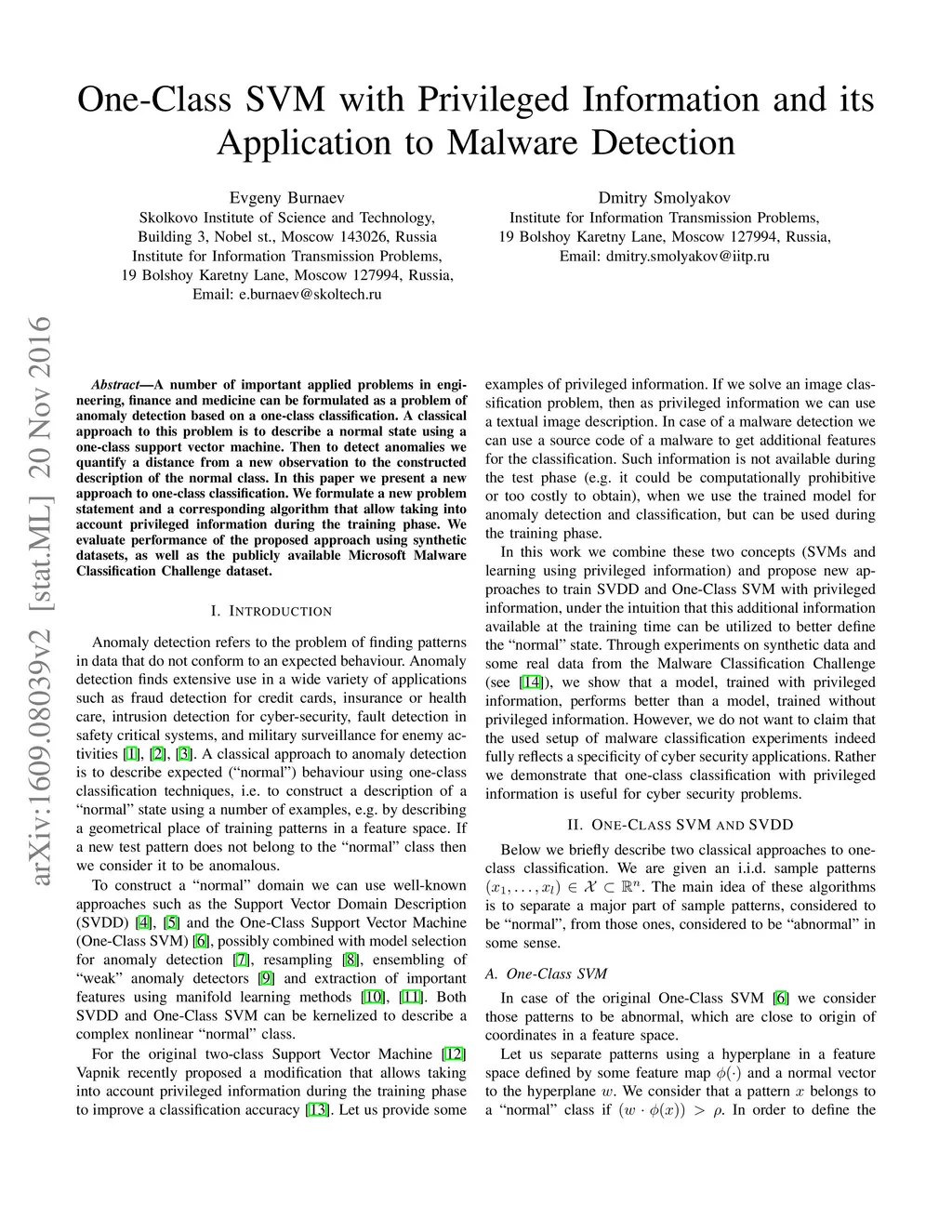 One-Class SVM with Privileged Information and its Application to Malware