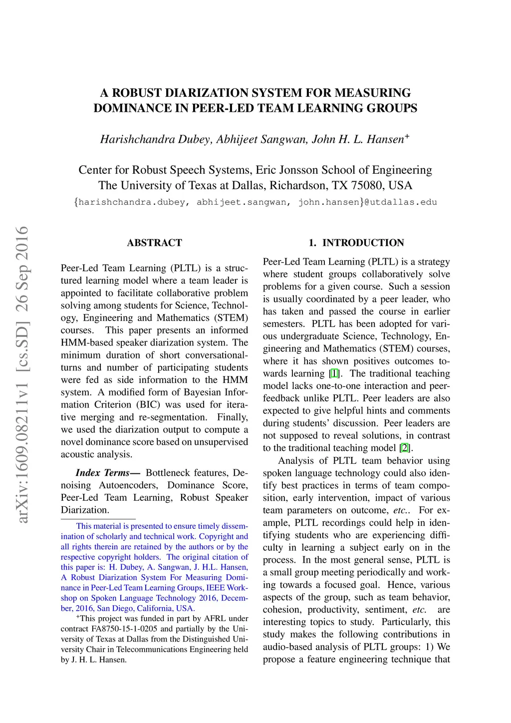 Peer-Led Team Learning (PLTL) is a structured learning model where a team leader is appointed to facilitate collaborative problem solving among students for Science, Technology, Engineering and Mathematics (STEM) courses. This paper presents an informed HMM-based speaker diarization system. The minimum duration of short conversationalturns and number of participating students were fed as side information to the HMM system. A modified form of Bayesian Information Criterion (BIC) was used for iterative merging and re-segmentation. Finally, we used the diarization output to compute a novel dominance score based on unsupervised acoustic analysis.