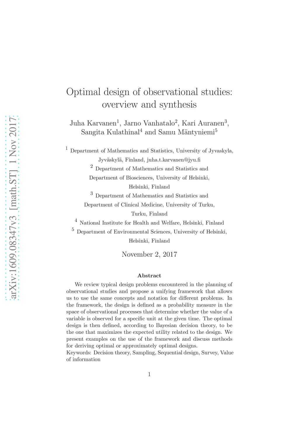 We review typical design problems encountered in the planning of observational studies and propose a unifying framework that allows us to use the same concepts and notation for different problems. In the framework, the design is defined as a probability measure in the space of observational processes that determine whether the value of a variable is observed for a specific unit at the given time. The optimal design is then defined, according to Bayesian decision theory, to be the one that maximizes the expected utility related to the design. We present examples on the use of the framework and discuss methods for deriving optimal or approximately optimal designs.