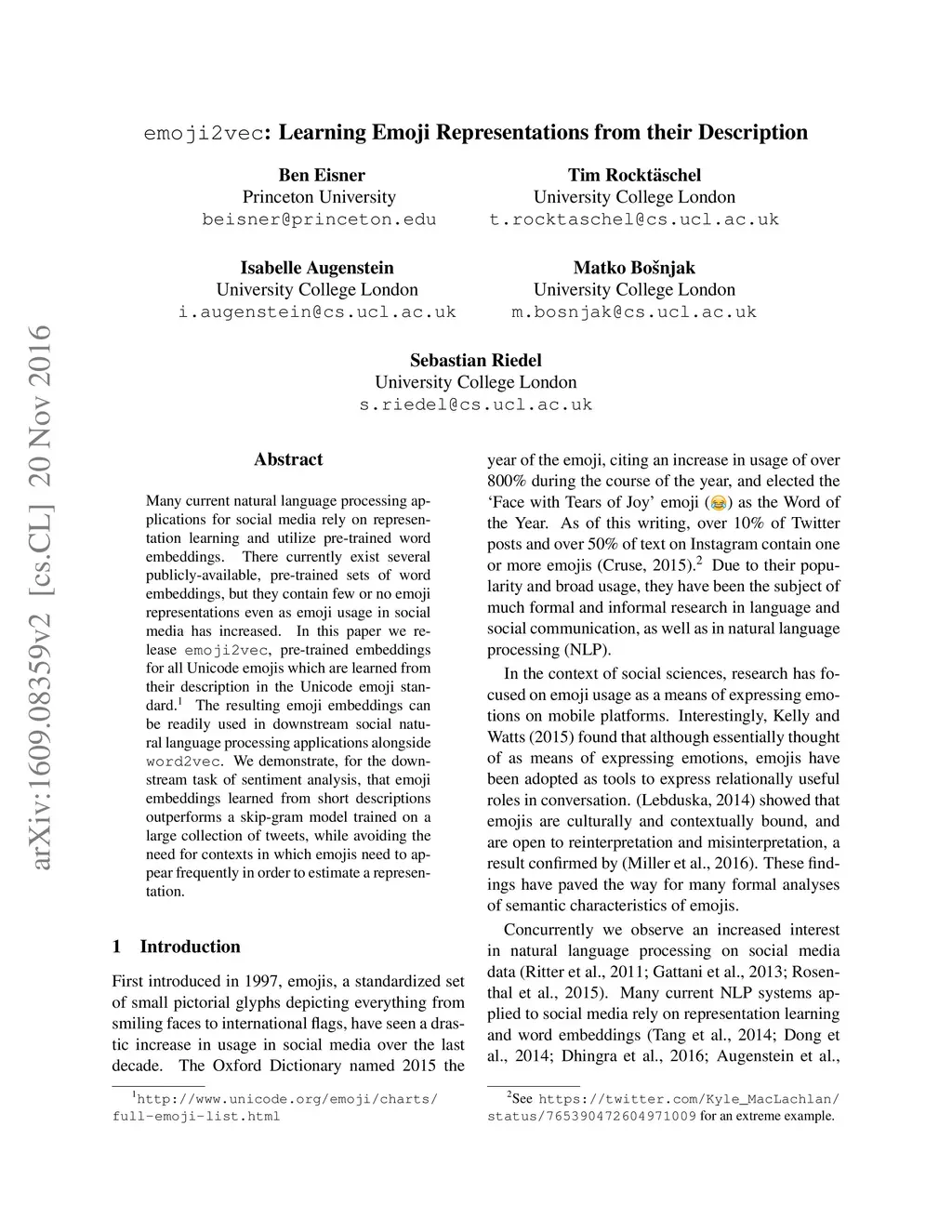emoji2vec: Learning Emoji Representations from their Description
