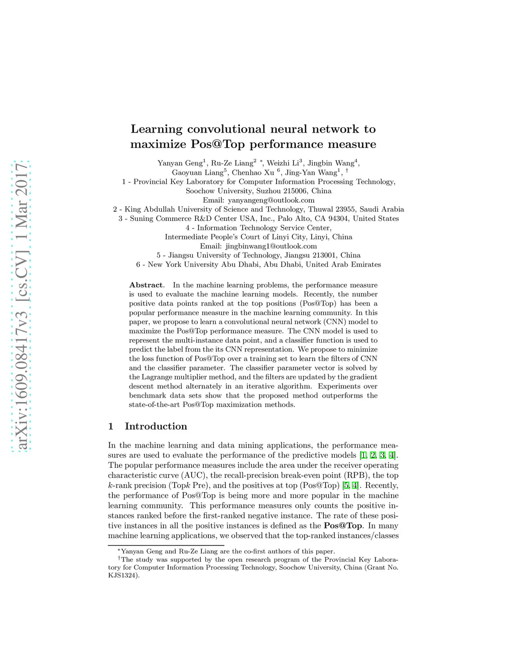 In the machine learning problems, the performance measure is used to evaluate the machine learning models. Recently, the number positive data points ranked at the top positions (Pos@Top) has been a popular performance measure in the machine learning community. In this paper, we propose to learn a convolutional neural network (CNN) model to maximize the Pos@Top performance measure. The CNN model is used to represent the multi-instance data point, and a classifier function is used to predict the label from the its CNN representation. We propose to minimize the loss function of Pos@Top over a training set to learn the filters of CNN and the classifier parameter. The classifier parameter vector is solved by the Lagrange multiplier method, and the filters are updated by the gradient descent method alternately in an iterative algorithm. Experiments over benchmark data sets show that the proposed method outperforms the state-of-the-art Pos@Top maximization methods.