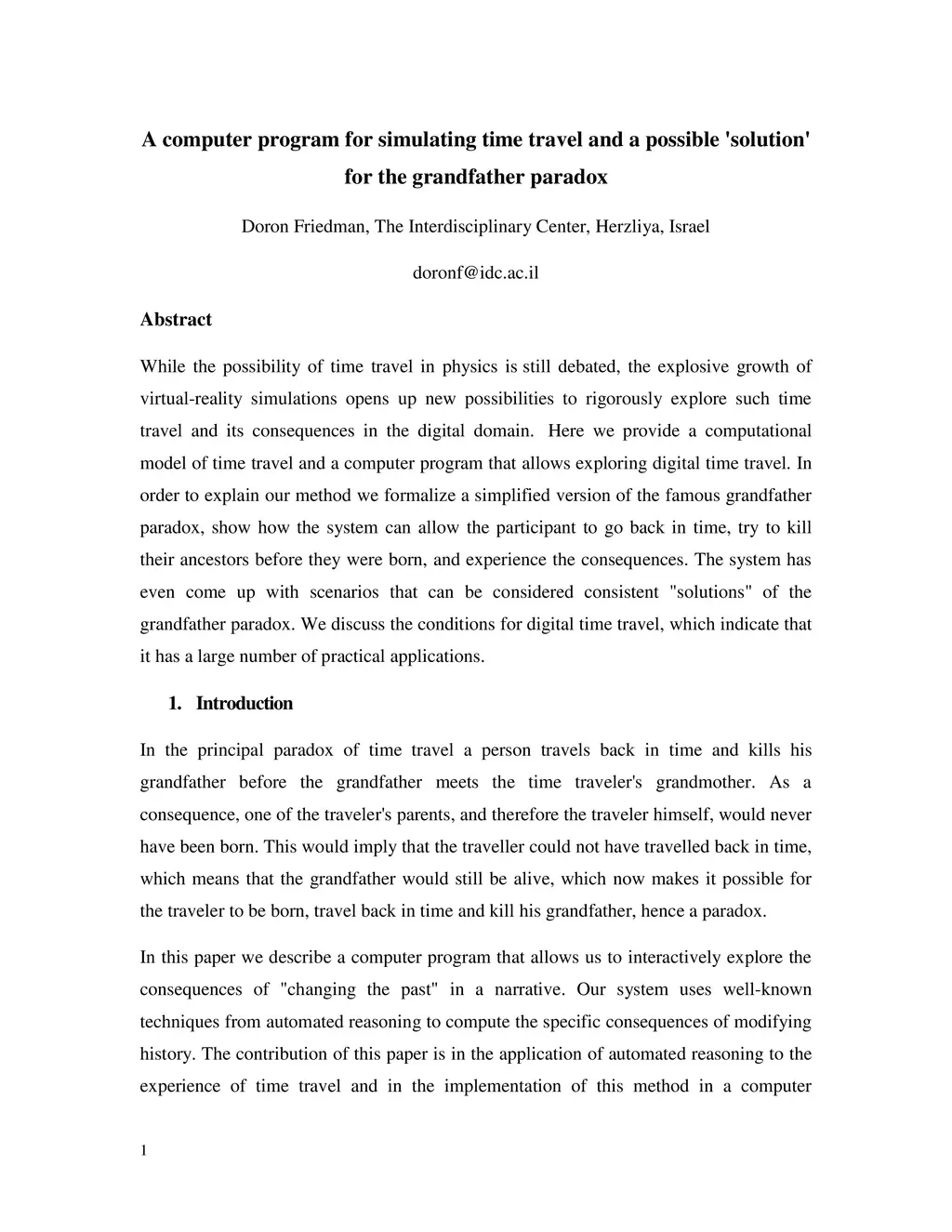 A computer program for simulating time travel and a possible 'solution'