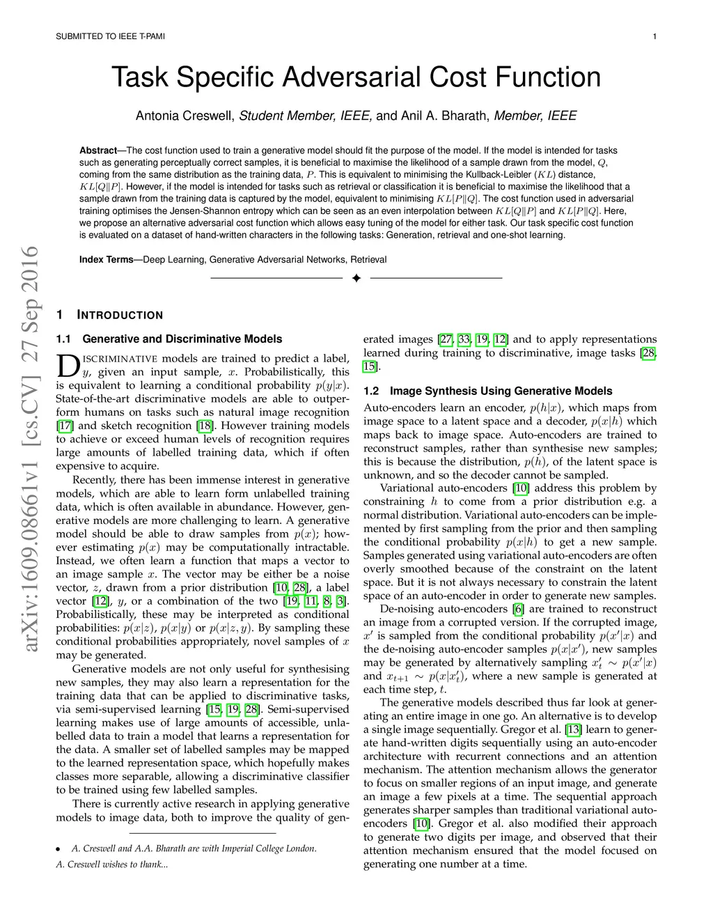 The cost function used to train a generative model should fit the purpose of the model. If the model is intended for tasks such as generating perceptually correct samples, it is beneficial to maximise the likelihood of a sample drawn from the model, Q, coming from the same distribution as the training data, P. This is equivalent to minimising the Kullback-Leibler (KL) distance, KL[Q||P]. However, if the model is intended for tasks such as retrieval or classification it is beneficial to maximise the likelihood that a sample drawn from the training data is captured by the model, equivalent to minimising KL[P||Q]. The cost function used in adversarial training optimises the Jensen-Shannon entropy which can be seen as an even interpolation between KL[Q||P] and KL[P||Q]. Here, we propose an alternative adversarial cost function which allows easy tuning of the model for either task. Our task specific cost function is evaluated on a dataset of hand-written characters in the following tasks: Generation, retrieval and one-shot learning.