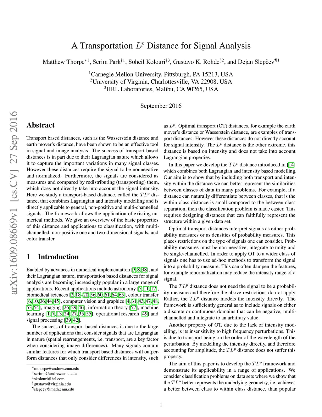 Transport based distances, such as the Wasserstein distance and earth mover's distance, have been shown to be an effective tool in signal and image analysis. The success of transport based distances is in part due to their Lagrangian nature which allows it to capture the important variations in many signal classes. However these distances require the signal to be nonnegative and normalized. Furthermore, the signals are considered as measures and compared by redistributing (transporting) them, which does not directly take into account the signal intensity. Here we study a transport-based distance, called the distance, that combines Lagrangian and intensity modelling and is directly applicable to general, non-positive and multi-channelled signals. The framework allows the application of existing numerical methods. We give an overview of the basic properties of this distance and applications to classification, with multi-channelled, non-positive one and two-dimensional signals, and color transfer.