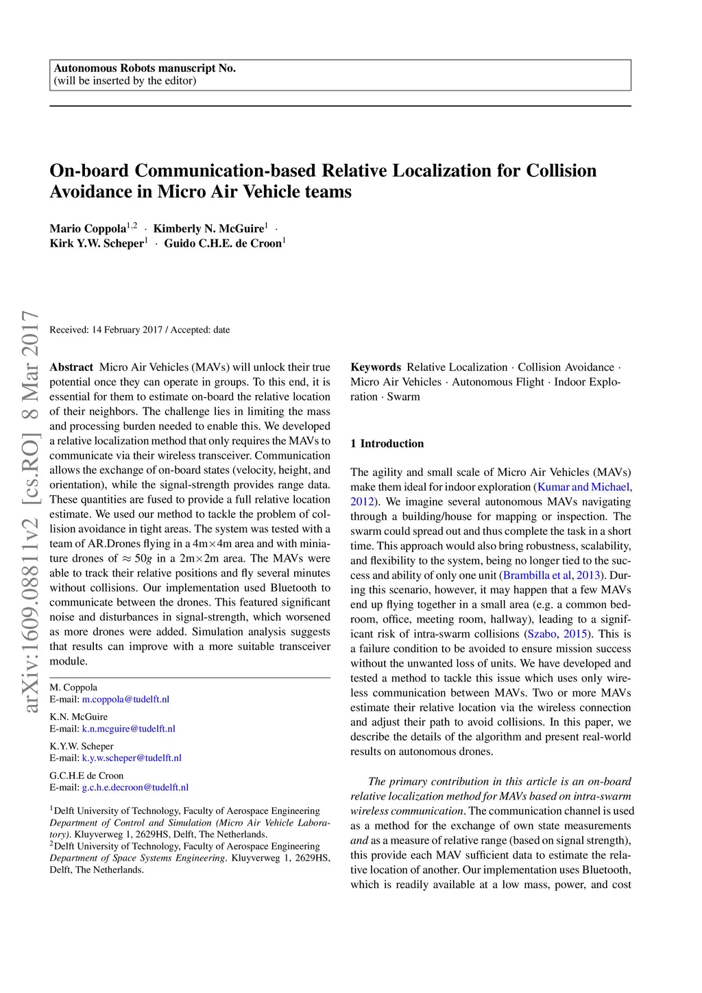 Micro Air Vehicles (MAVs) will unlock their true potential once they can operate in groups. To this end, it is essential for them to estimate on-board the relative location of their neighbors. The challenge lies in limiting the mass and processing burden needed to enable this. We developed a relative localization method that only requires the MAVs to communicate via their wireless transceiver. Communication allows the exchange of on-board states (velocity, height, and orientation), while the signal-strength provides range data. These quantities are fused to provide a full relative location estimate. We used our method to tackle the problem of collision avoidance in tight areas. The system was tested with a team of AR.Drones flying in a 4mx4m area and with miniature drones of ~50g in a 2mx2m area. The MAVs were able to track their relative positions and fly several minutes without collisions. Our implementation used Bluetooth to communicate between the drones. This featured significant noise and disturbances in signal-strength, which worsened as more drones were added. Simulation analysis suggests that results can improve with a more suitable transceiver module.