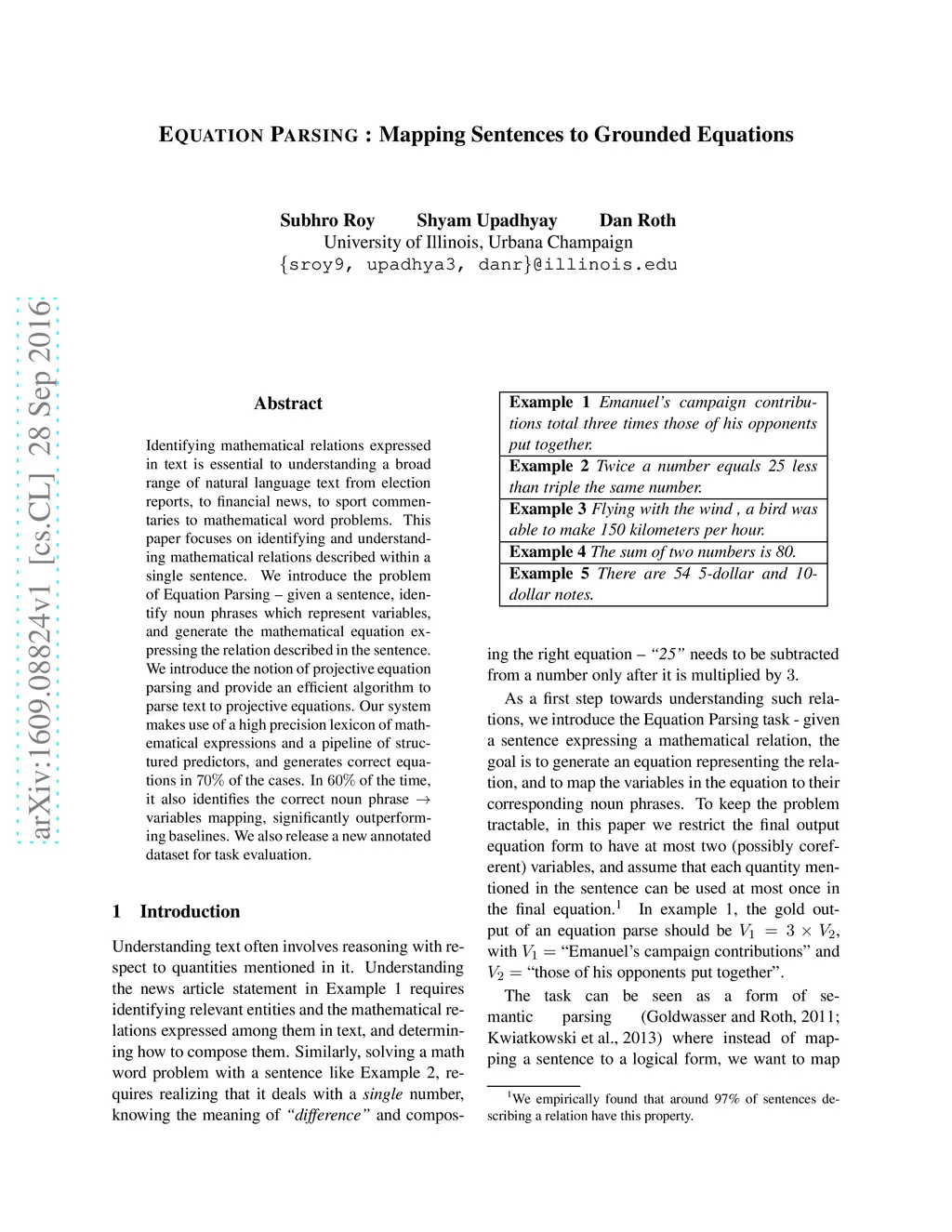 Identifying mathematical relations expressed in text is essential to understanding a broad range of natural language text from election reports, to financial news, to sport commentaries to mathematical word problems. This paper focuses on identifying and understanding mathematical relations described within a single sentence. We introduce the problem of Equation Parsing -- given a sentence, identify noun phrases which represent variables, and generate the mathematical equation expressing the relation described in the sentence. We introduce the notion of projective equation parsing and provide an efficient algorithm to parse text to projective equations. Our system makes use of a high precision lexicon of mathematical expressions and a pipeline of structured predictors, and generates correct equations in of the cases. In of the time, it also identifies the correct noun phrase variables mapping, significantly outperforming baselines. We also release a new annotated dataset for task evaluation.