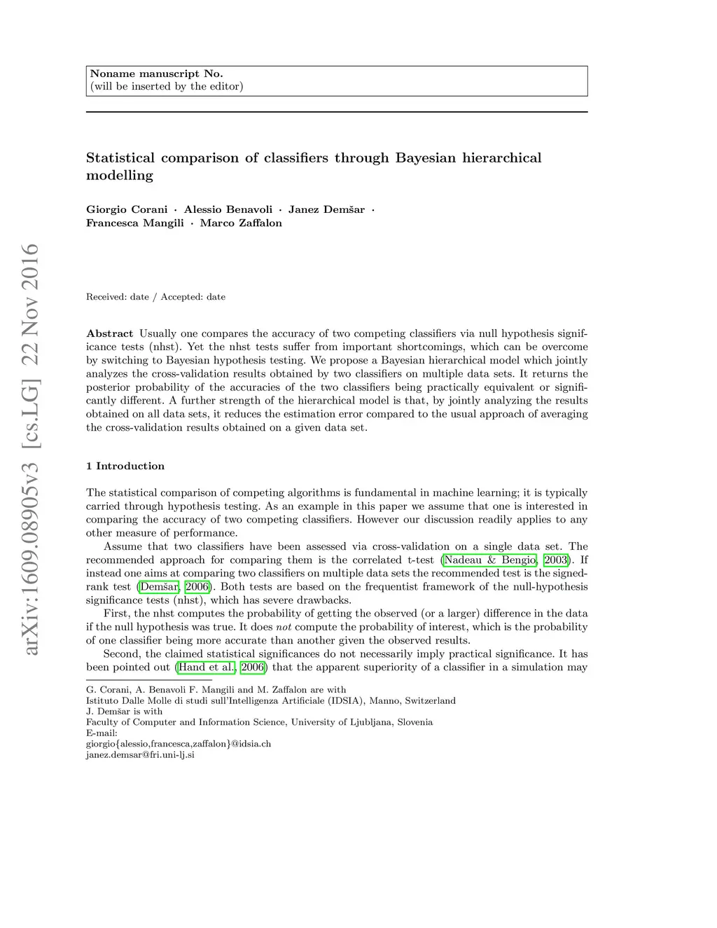 Usually one compares the accuracy of two competing classifiers via null hypothesis significance tests (nhst). Yet the nhst tests suffer from important shortcomings, which can be overcome by switching to Bayesian hypothesis testing. We propose a Bayesian hierarchical model which jointly analyzes the cross-validation results obtained by two classifiers on multiple data sets. It returns the posterior probability of the accuracies of the two classifiers being practically equivalent or significantly different. A further strength of the hierarchical model is that, by jointly analyzing the results obtained on all data sets, it reduces the estimation error compared to the usual approach of averaging the cross-validation results obtained on a given data set.