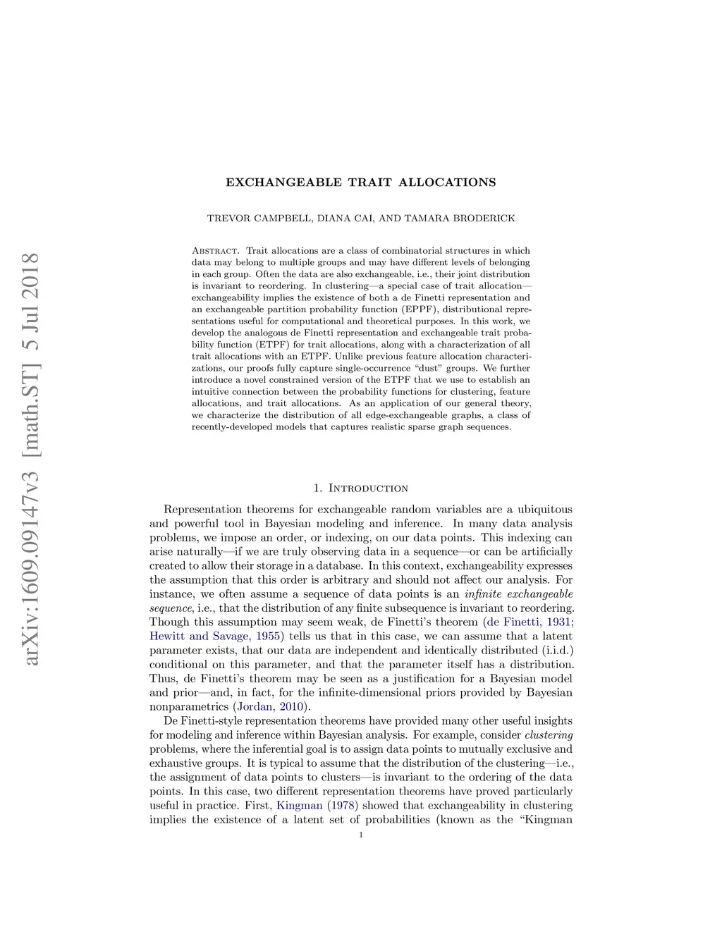 Trait allocations are a class of combinatorial structures in which data may belong to multiple groups and may have different levels of belonging in each group. Often the data are also exchangeable, i.e., their joint distribution is invariant to reordering. In clustering---a special case of trait allocation---exchangeability implies the existence of both a de Finetti representation and an exchangeable partition probability function (EPPF), distributional representations useful for computational and theoretical purposes. In this work, we develop the analogous de Finetti representation and exchangeable trait probability function (ETPF) for trait allocations, along with a characterization of all trait allocations with an ETPF. Unlike previous feature allocation characterizations, our proofs fully capture single-occurrence "dust" groups. We further introduce a novel constrained version of the ETPF that we use to establish an intuitive connection between the probability functions for clustering, feature allocations, and trait allocations. As an application of our general theory, we characterize the distribution of all edge-exchangeable graphs, a class of recently-developed models that captures realistic sparse graph sequences.