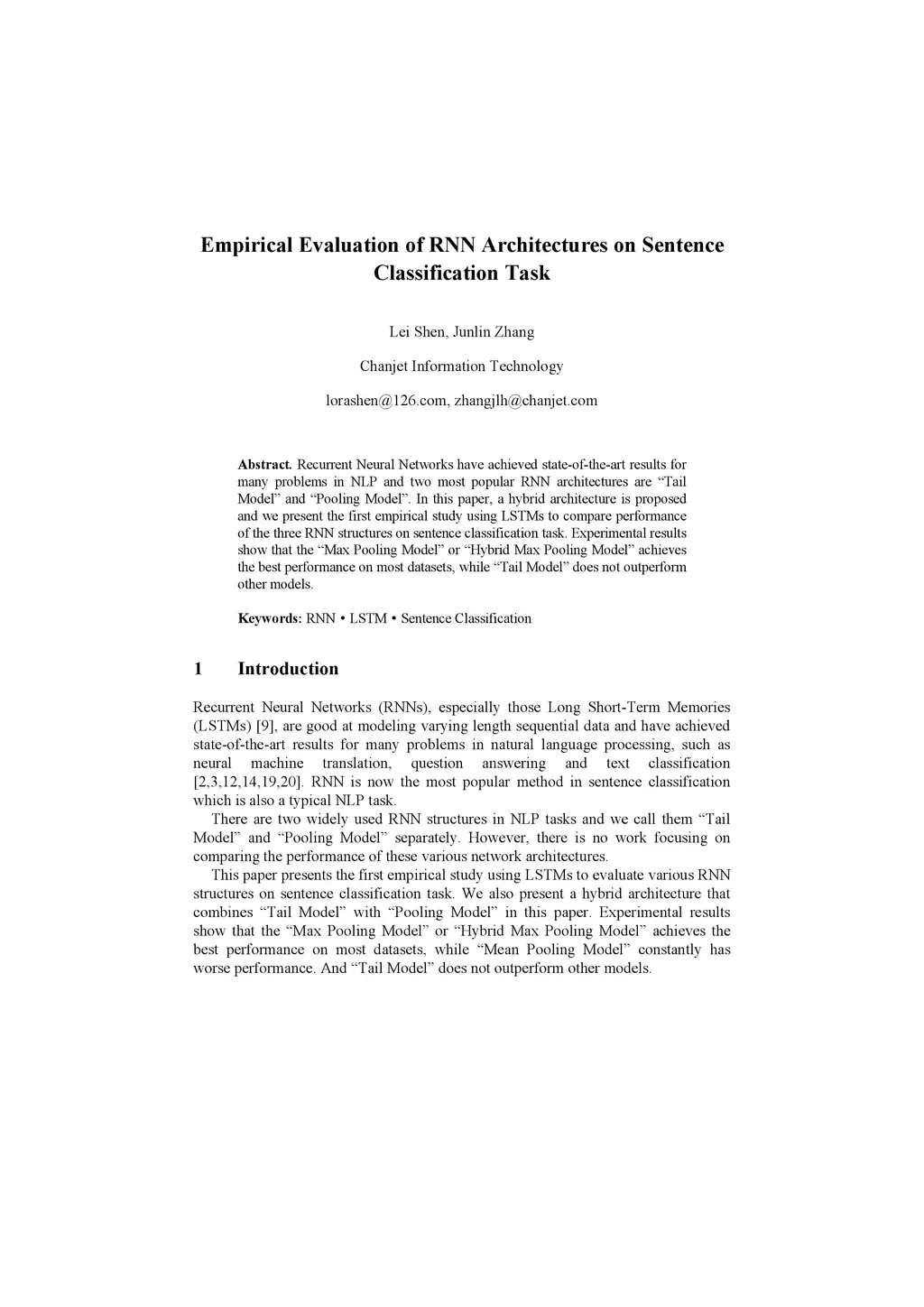Recurrent Neural Networks have achieved state-of-the-art results for many problems in NLP and two most popular RNN architectures are Tail Model and Pooling Model. In this paper, a hybrid architecture is proposed and we present the first empirical study using LSTMs to compare performance of the three RNN structures on sentence classification task. Experimental results show that the Tail Model and Hybrid Model consistently get a better performance over Pooling Model, and Hybrid Model is comparable with Tail Model.