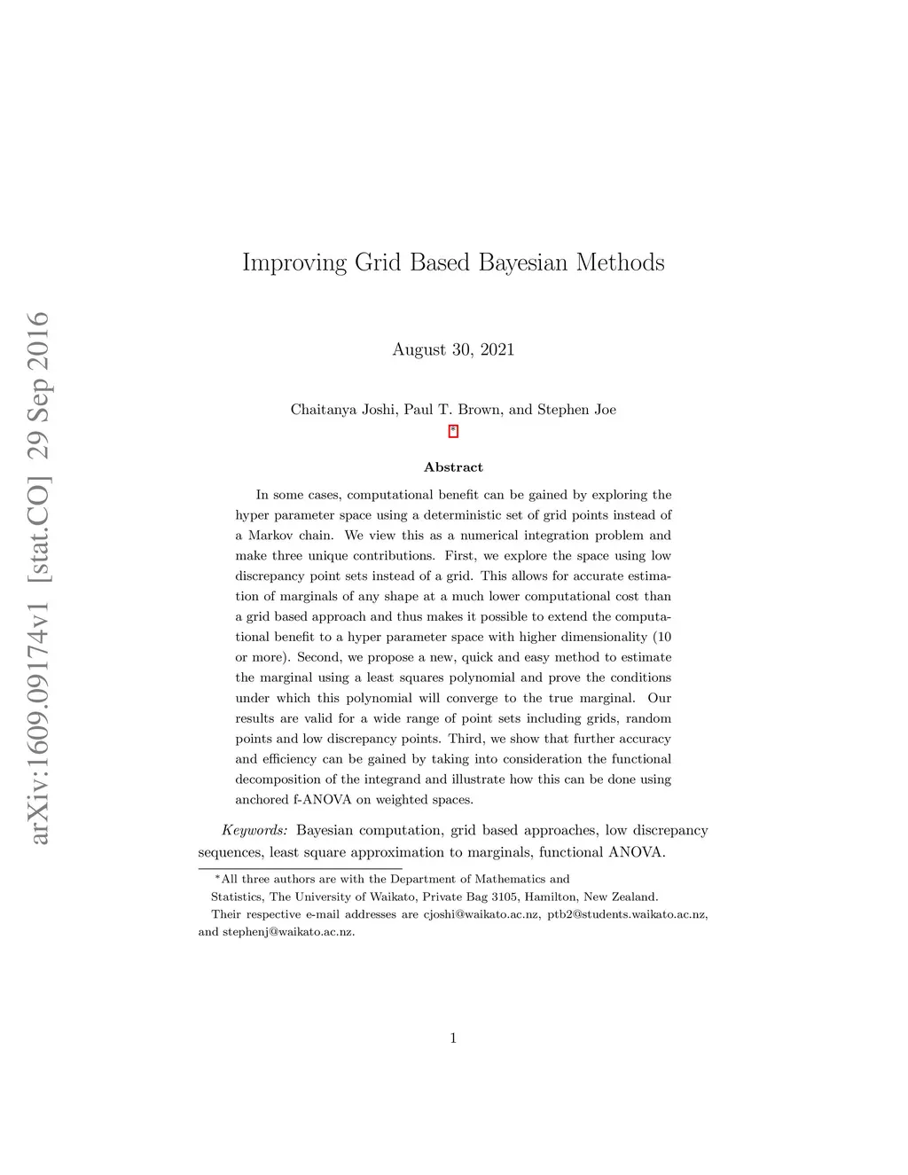 In some cases, computational benefit can be gained by exploring the hyper parameter space using a deterministic set of grid points instead of a Markov chain. We view this as a numerical integration problem and make three unique contributions. First, we explore the space using low discrepancy point sets instead of a grid. This allows for accurate estimation of marginals of any shape at a much lower computational cost than a grid based approach and thus makes it possible to extend the computational benefit to a hyper parameter space with higher dimensionality (10 or more). Second, we propose a new, quick and easy method to estimate the marginal using a least squares polynomial and prove the conditions under which this polynomial will converge to the true marginal. Our results are valid for a wide range of point sets including grids, random points and low discrepancy points. Third, we show that further accuracy and efficiency can be gained by taking into consideration the functional decomposition of the integrand and illustrate how this can be done using anchored f-ANOVA on weighted spaces.