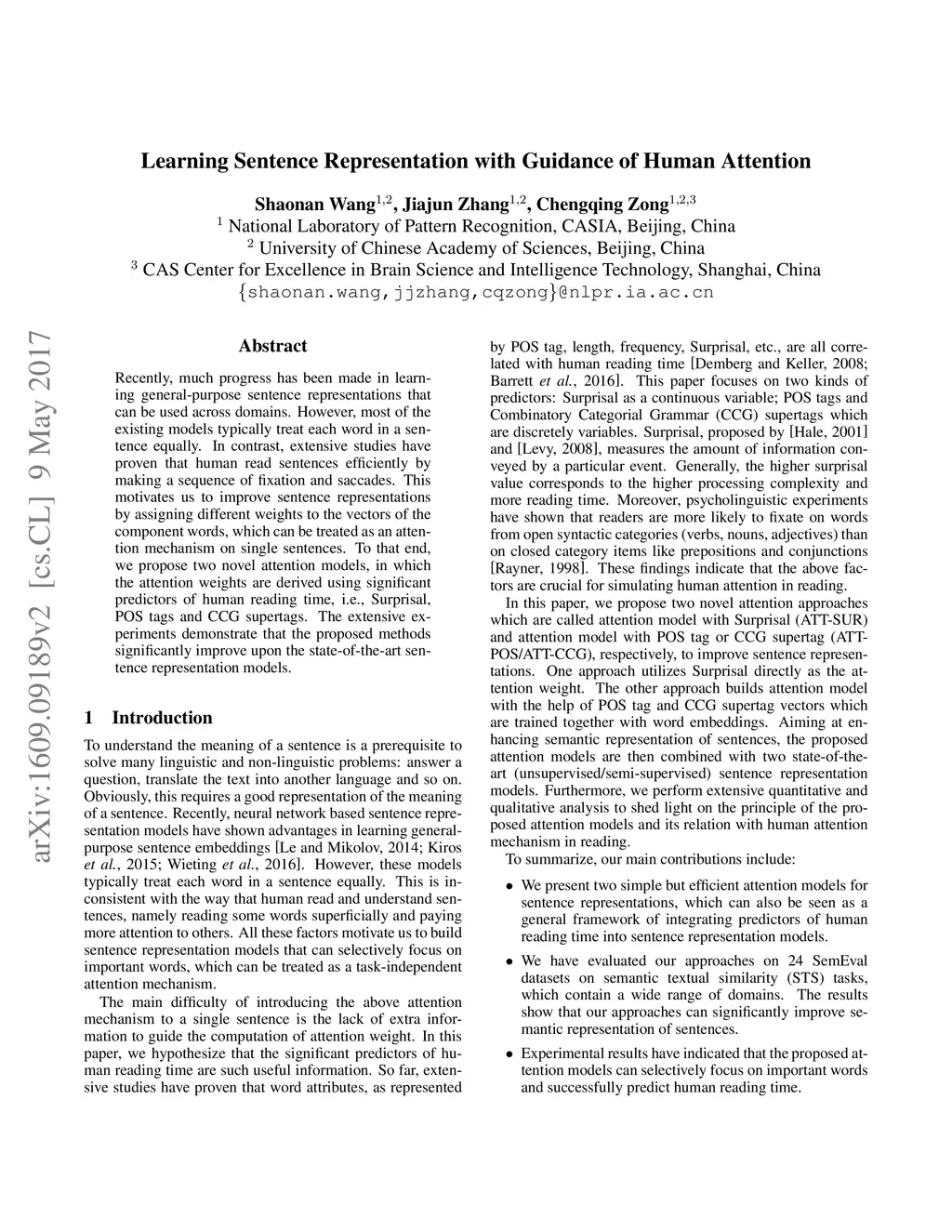 Recently, much progress has been made in learning general-purpose sentence representations that can be used across domains. However, most of the existing models typically treat each word in a sentence equally. In contrast, extensive studies have proven that human read sentences efficiently by making a sequence of fixation and saccades. This motivates us to improve sentence representations by assigning different weights to the vectors of the component words, which can be treated as an attention mechanism on single sentences. To that end, we propose two novel attention models, in which the attention weights are derived using significant predictors of human reading time, i.e., Surprisal, POS tags and CCG supertags. The extensive experiments demonstrate that the proposed methods significantly improve upon the state-of-the-art sentence representation models.