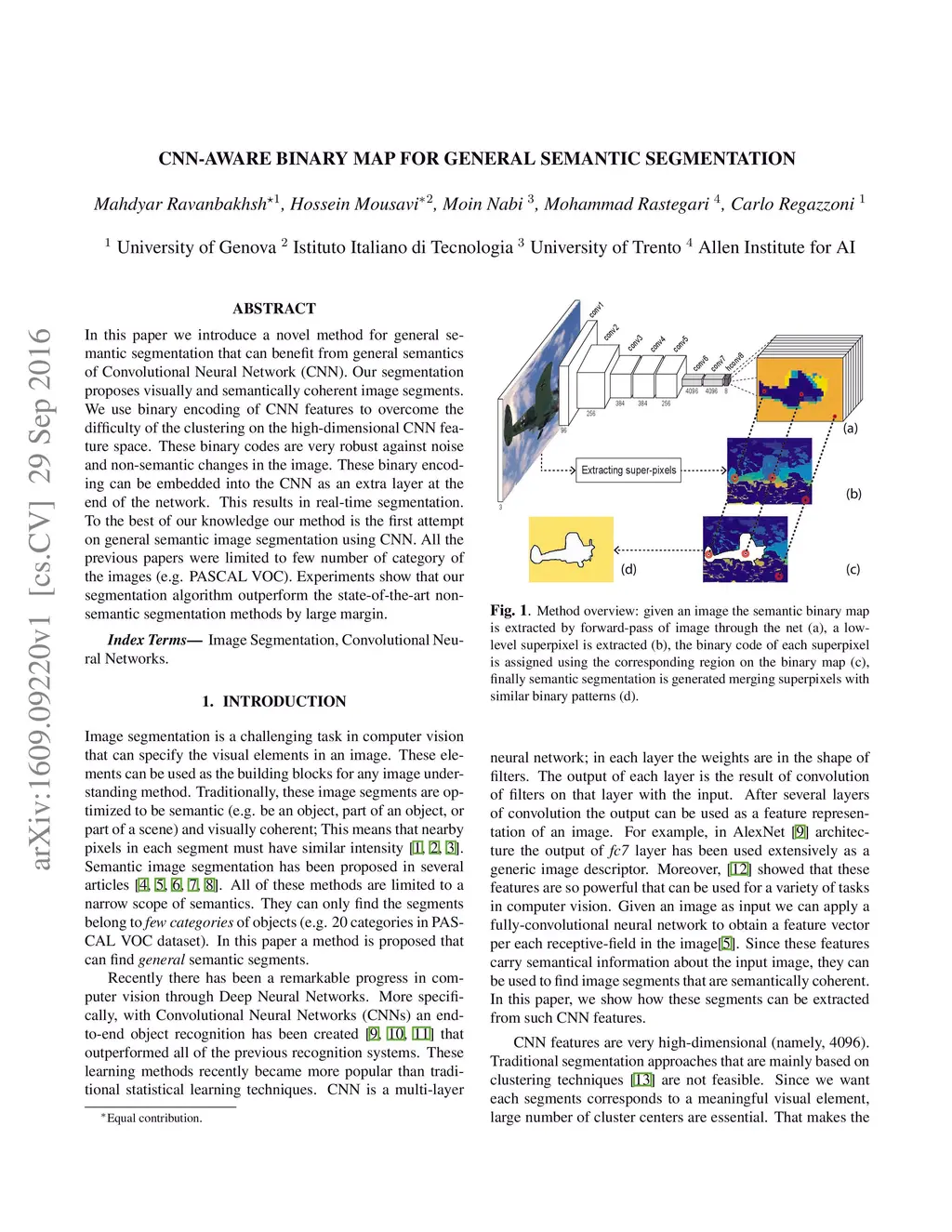 In this paper we introduce a novel method for general semantic segmentation that can benefit from general semantics of Convolutional Neural Network (CNN). Our segmentation proposes visually and semantically coherent image segments. We use binary encoding of CNN features to overcome the difficulty of the clustering on the high-dimensional CNN feature space. These binary codes are very robust against noise and non-semantic changes in the image. These binary encoding can be embedded into the CNN as an extra layer at the end of the network. This results in real-time segmentation. To the best of our knowledge our method is the first attempt on general semantic image segmentation using CNN. All the previous papers were limited to few number of category of the images (e.g. PASCAL VOC). Experiments show that our segmentation algorithm outperform the state-of-the-art non-semantic segmentation methods by large margin.