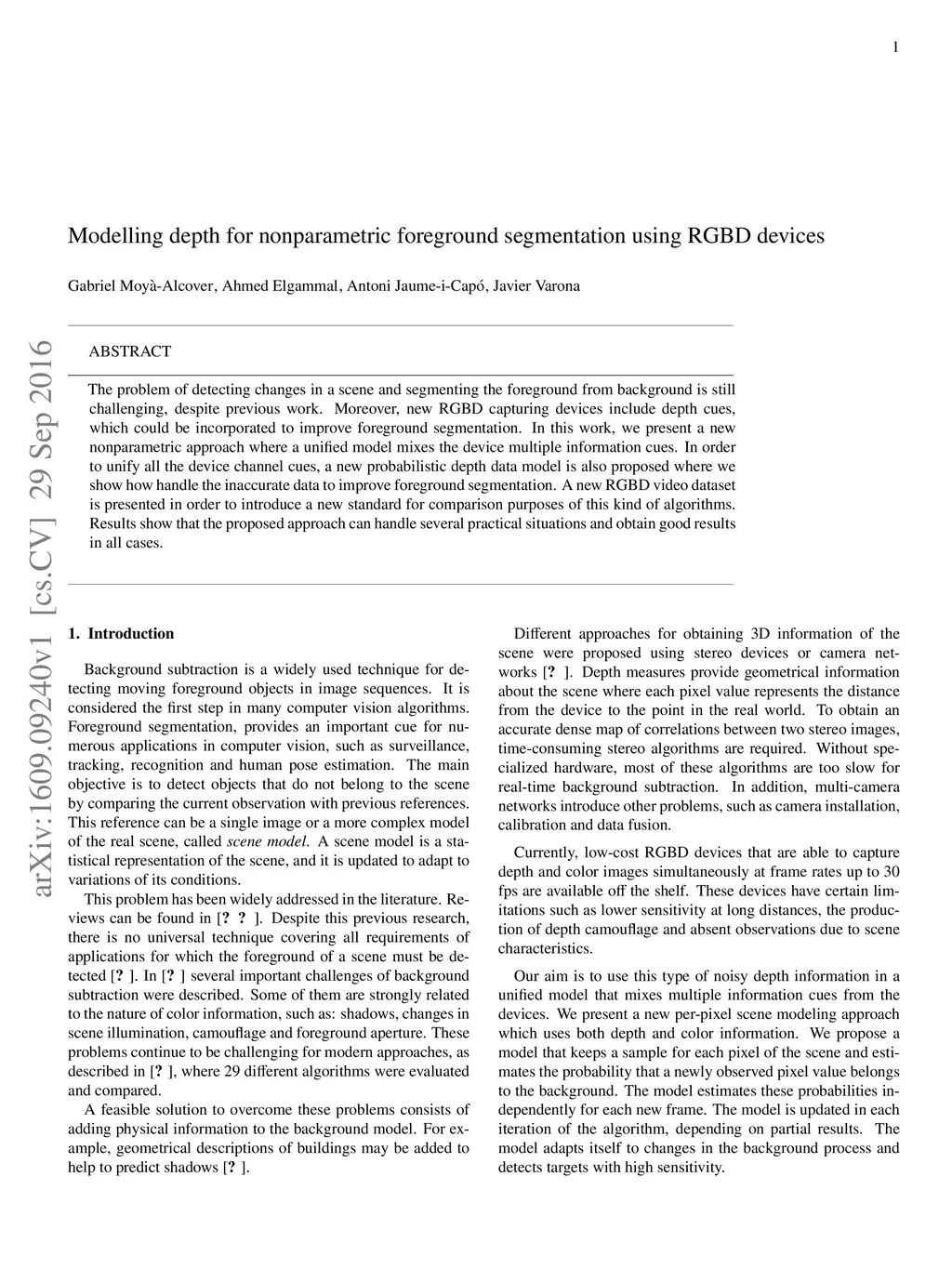 Modelling depth for nonparametric foreground segmentation using RGBD