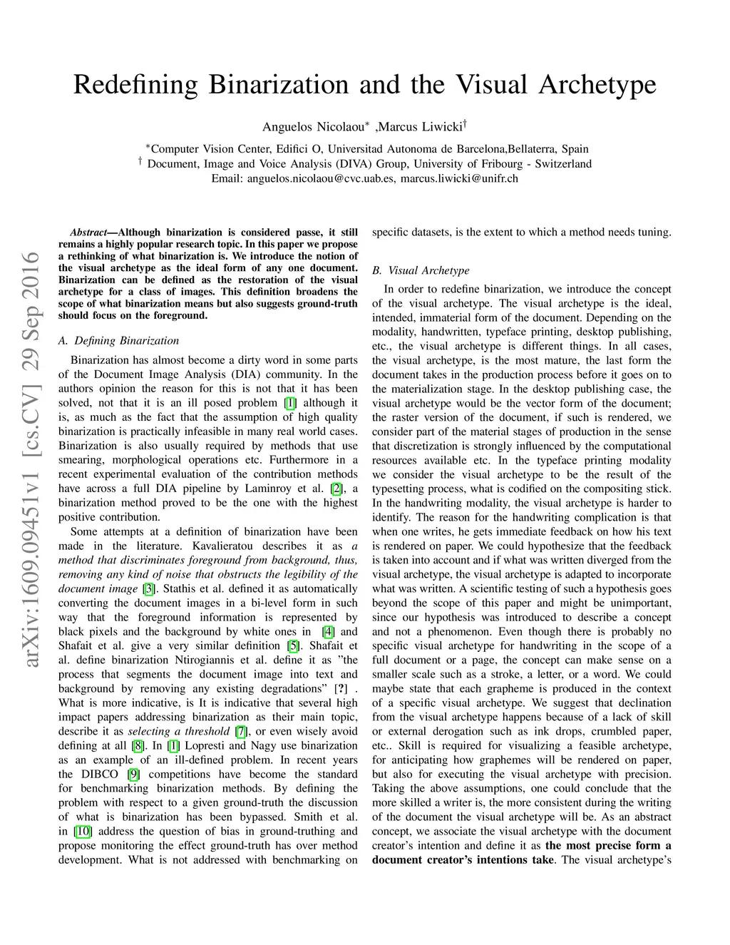 Although binarization is considered passe, it still remains a highly popular research topic. In this paper we propose a rethinking of what binarization is. We introduce the notion of the visual archetype as the ideal form of any one document. Binarization can be defined as the restoration of the visual archetype for a class of images. This definition broadens the scope of what binarization means but also suggests ground-truth should focus on the foreground.