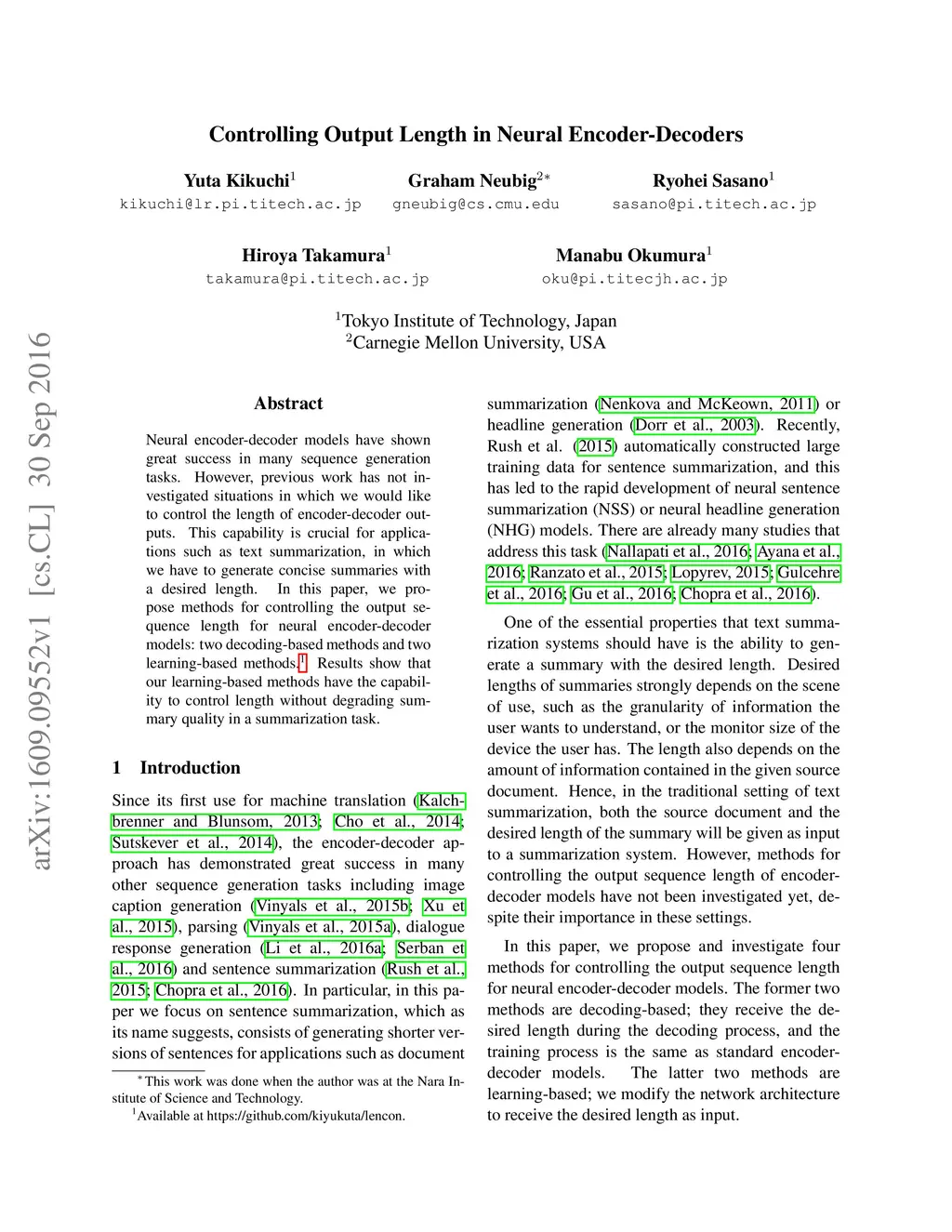 Neural encoder-decoder models have shown great success in many sequence generation tasks. However, previous work has not investigated situations in which we would like to control the length of encoder-decoder outputs. This capability is crucial for applications such as text summarization, in which we have to generate concise summaries with a desired length. In this paper, we propose methods for controlling the output sequence length for neural encoder-decoder models: two decoding-based methods and two learning-based methods. Results show that our learning-based methods have the capability to control length without degrading summary quality in a summarization task.