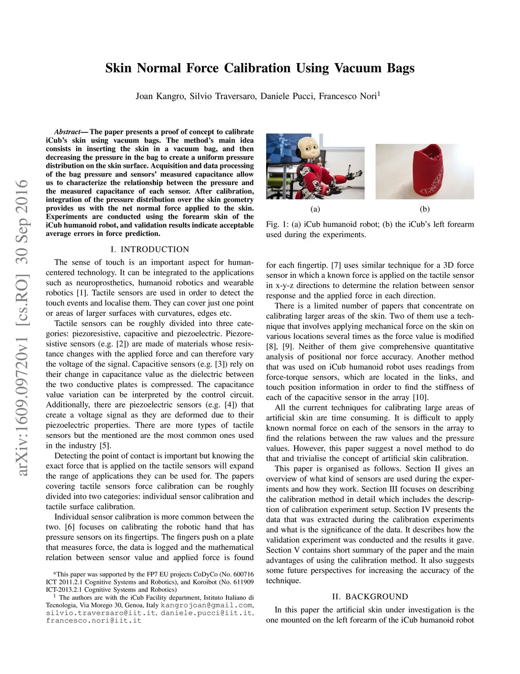 The paper presents a proof of concept to calibrate iCub's skin using vacuum bags. The method's main idea consists in inserting the skin in a vacuum bag, and then decreasing the pressure in the bag to create a uniform pressure distribution on the skin surface. Acquisition and data processing of the bag pressure and sensors' measured capacitance allow us to characterize the relationship between the pressure and the measured capacitance of each sensor. After calibration, integration of the pressure distribution over the skin geometry provides us with the net normal force applied to the skin. Experiments are conducted using the forearm skin of the iCub humanoid robot, and validation results indicate acceptable average errors in force prediction.