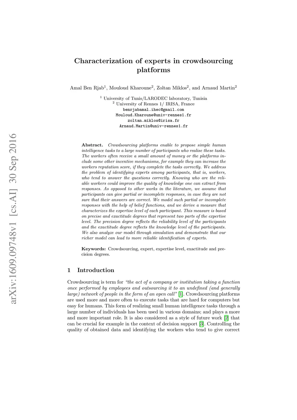 Crowdsourcing platforms enable to propose simple human intelligence tasks to a large number of participants who realise these tasks. The workers often receive a small amount of money or the platforms include some other incentive mechanisms, for example they can increase the workers reputation score, if they complete the tasks correctly. We address the problem of identifying experts among participants, that is, workers, who tend to answer the questions correctly. Knowing who are the reliable workers could improve the quality of knowledge one can extract from responses. As opposed to other works in the literature, we assume that participants can give partial or incomplete responses, in case they are not sure that their answers are correct. We model such partial or incomplete responses with the help of belief functions, and we derive a measure that characterizes the expertise level of each participant. This measure is based on precise and exactitude degrees that represent two parts of the expertise level. The precision degree reflects the reliability level of the participants and the exactitude degree reflects the knowledge level of the participants. We also analyze our model through simulation and demonstrate that our richer model can lead to more reliable identification of experts.