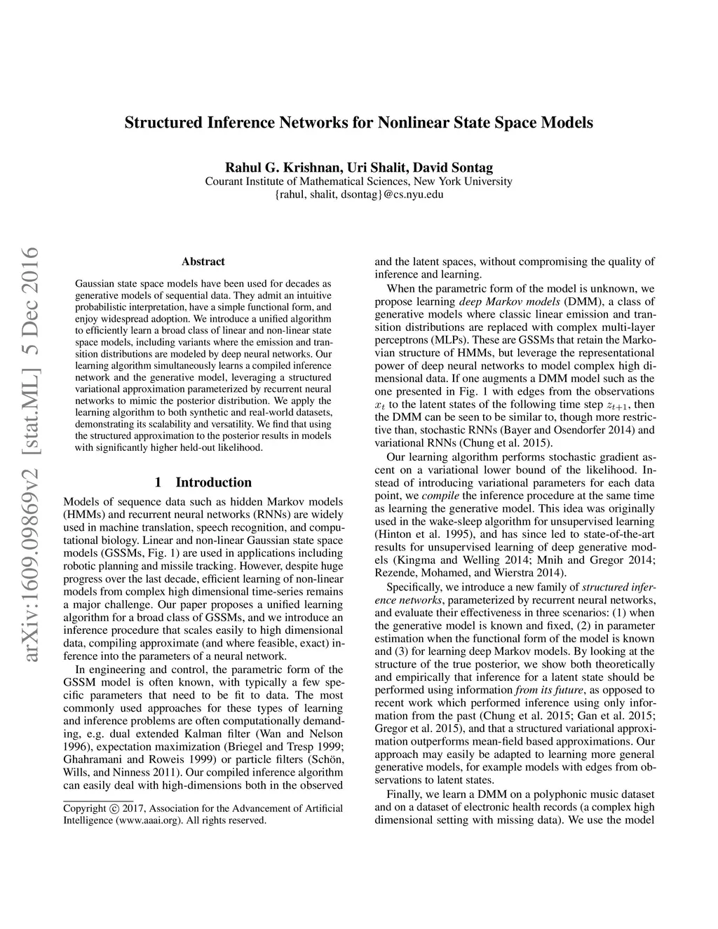 Gaussian state space models have been used for decades as generative models of sequential data. They admit an intuitive probabilistic interpretation, have a simple functional form, and enjoy widespread adoption. We introduce a unified algorithm to efficiently learn a broad class of linear and non-linear state space models, including variants where the emission and transition distributions are modeled by deep neural networks. Our learning algorithm simultaneously learns a compiled inference network and the generative model, leveraging a structured variational approximation parameterized by recurrent neural networks to mimic the posterior distribution. We apply the learning algorithm to both synthetic and real-world datasets, demonstrating its scalability and versatility. We find that using the structured approximation to the posterior results in models with significantly higher held-out likelihood.