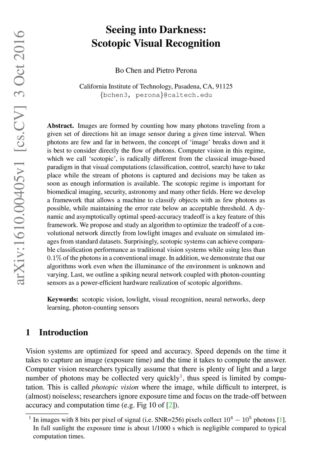 Images are formed by counting how many photons traveling from a given set of directions hit an image sensor during a given time interval. When photons are few and far in between, the concept of `image' breaks down and it is best to consider directly the flow of photons. Computer vision in this regime, which we call `scotopic', is radically different from the classical image-based paradigm in that visual computations (classification, control, search) have to take place while the stream of photons is captured and decisions may be taken as soon as enough information is available. The scotopic regime is important for biomedical imaging, security, astronomy and many other fields. Here we develop a framework that allows a machine to classify objects with as few photons as possible, while maintaining the error rate below an acceptable threshold. A dynamic and asymptotically optimal speed-accuracy tradeoff is a key feature of this framework. We propose and study an algorithm to optimize the tradeoff of a convolutional network directly from lowlight images and evaluate on simulated images from standard datasets. Surprisingly, scotopic systems can achieve comparable classification performance as traditional vision systems while using less than 0.1% of the photons in a conventional image. In addition, we demonstrate that our algorithms work even when the illuminance of the environment is unknown and varying. Last, we outline a spiking neural network coupled with photon-counting sensors as a power-efficient hardware realization of scotopic algorithms.